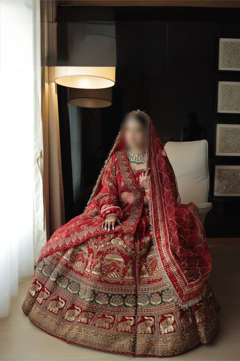10A timeless red bridal lehenga featuring intricate zari and resham embroidery with royal motifs like elephants and temple designs. Styled with two dupattas—one richly embroidered and one delicately netted for the head—this look blends tradition and grandeur, perfect for a regal wedding celebration.