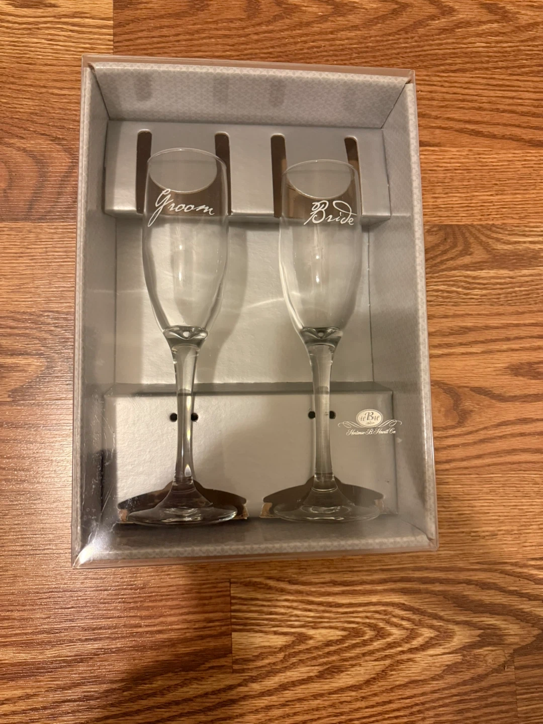 73Selling a set of Hortense B. Hewitt champagne flutes, perfect for a wedding celebration! The set includes a 'Bride' flute and a 'Groom' flute. The original box is included.