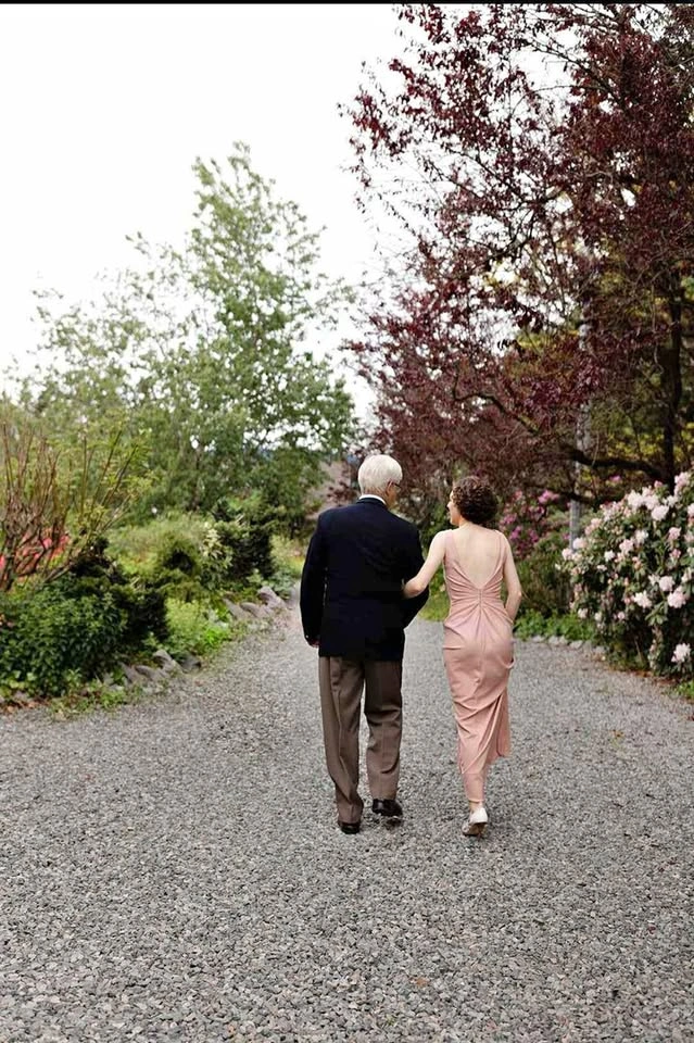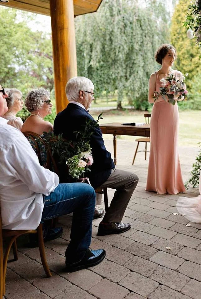 25Peachy pink bridesmaid dress purchased from Jealous Bridesmaids in 2022. Style 1887 from Bari Jay, stretch crepe in Deco Peach (but quite pink in person). Worn once for my mom's wedding then cleaned. Originally a size 6; altered to a size 4. $60 OBO (originally ~$200).