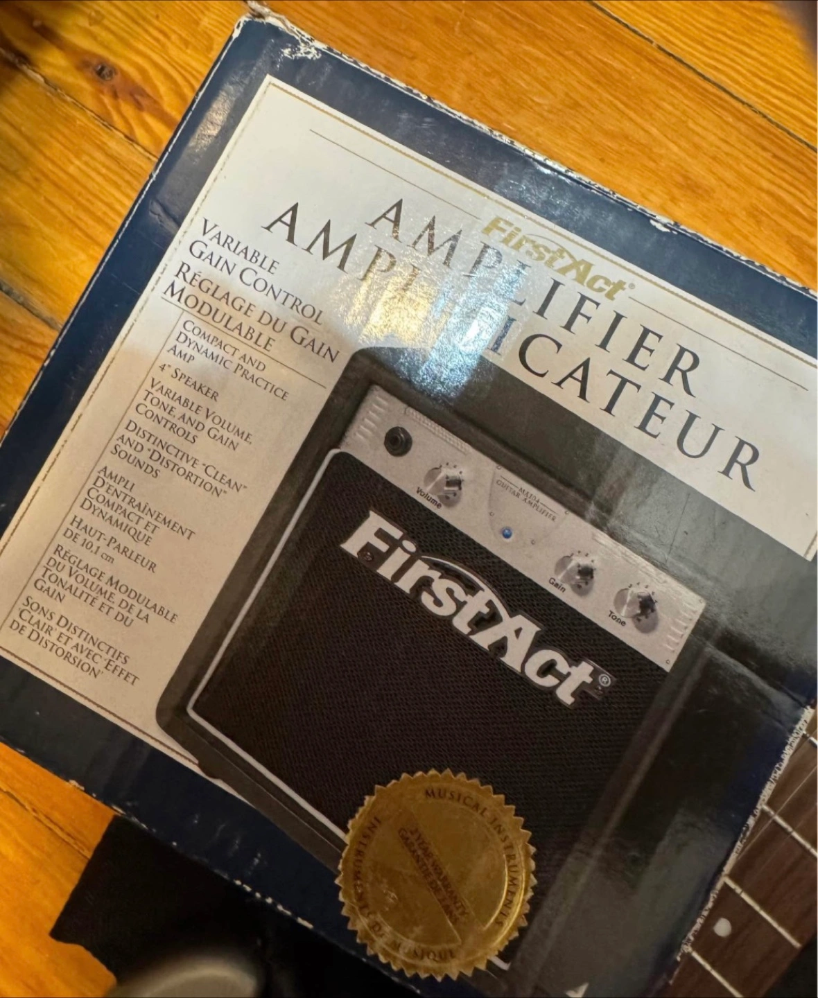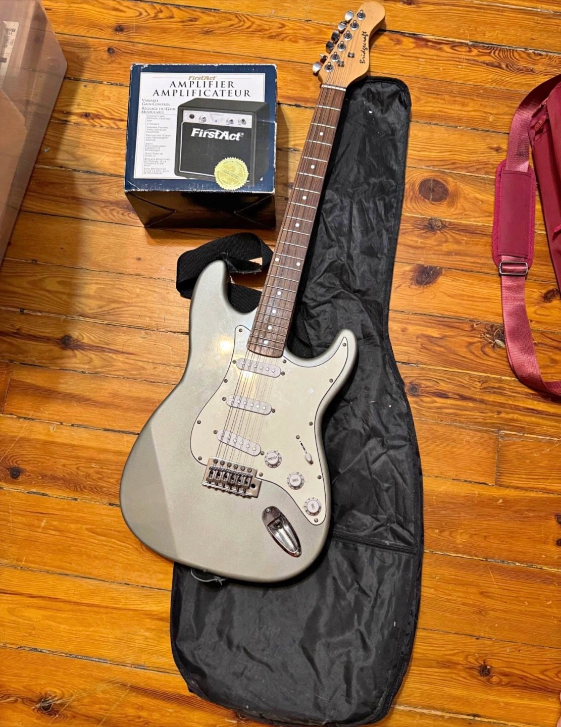 Guitar with a silver finish and a case. Comes with a black amplifier. Playing this guitar would be a great way to relax after a long day.