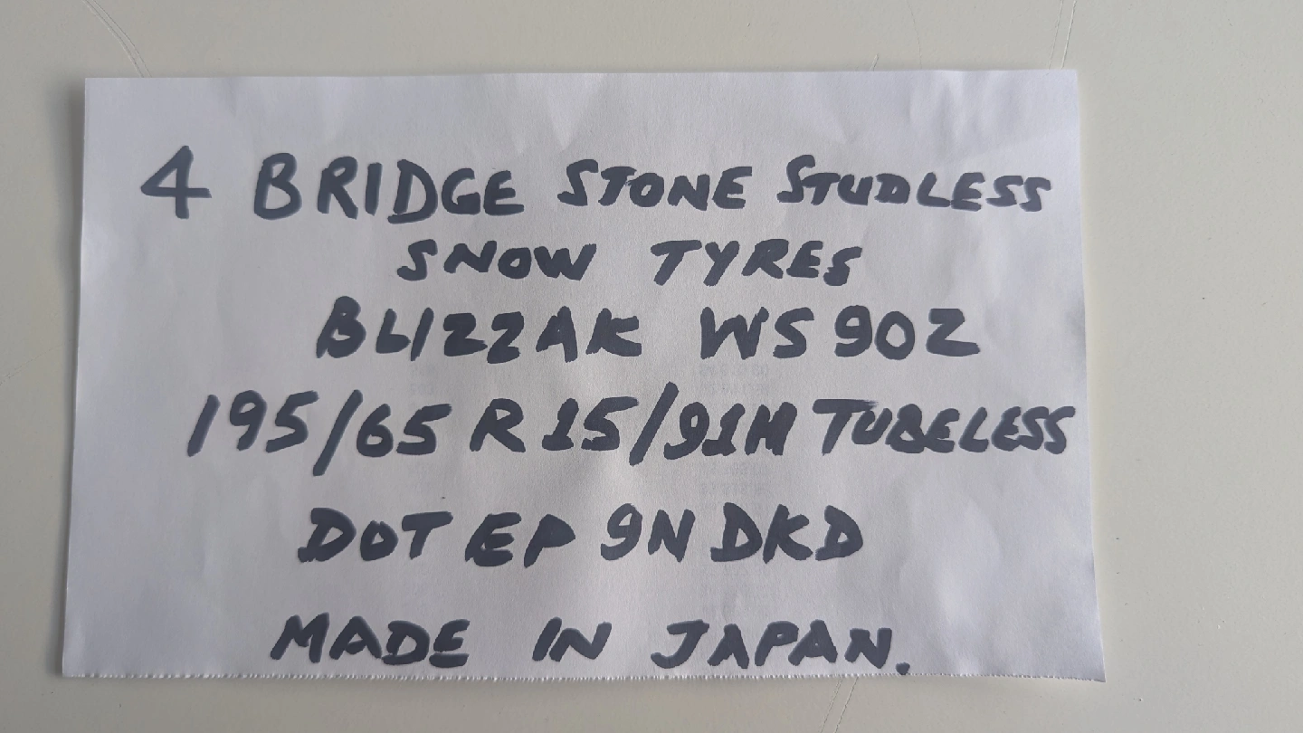 Selling a set of four Bridgestone Blizzak WS90 studless snow tires. They are size 195/65 R15 91M and tubeless. These tires were made in Japan and are ready for the winter season!