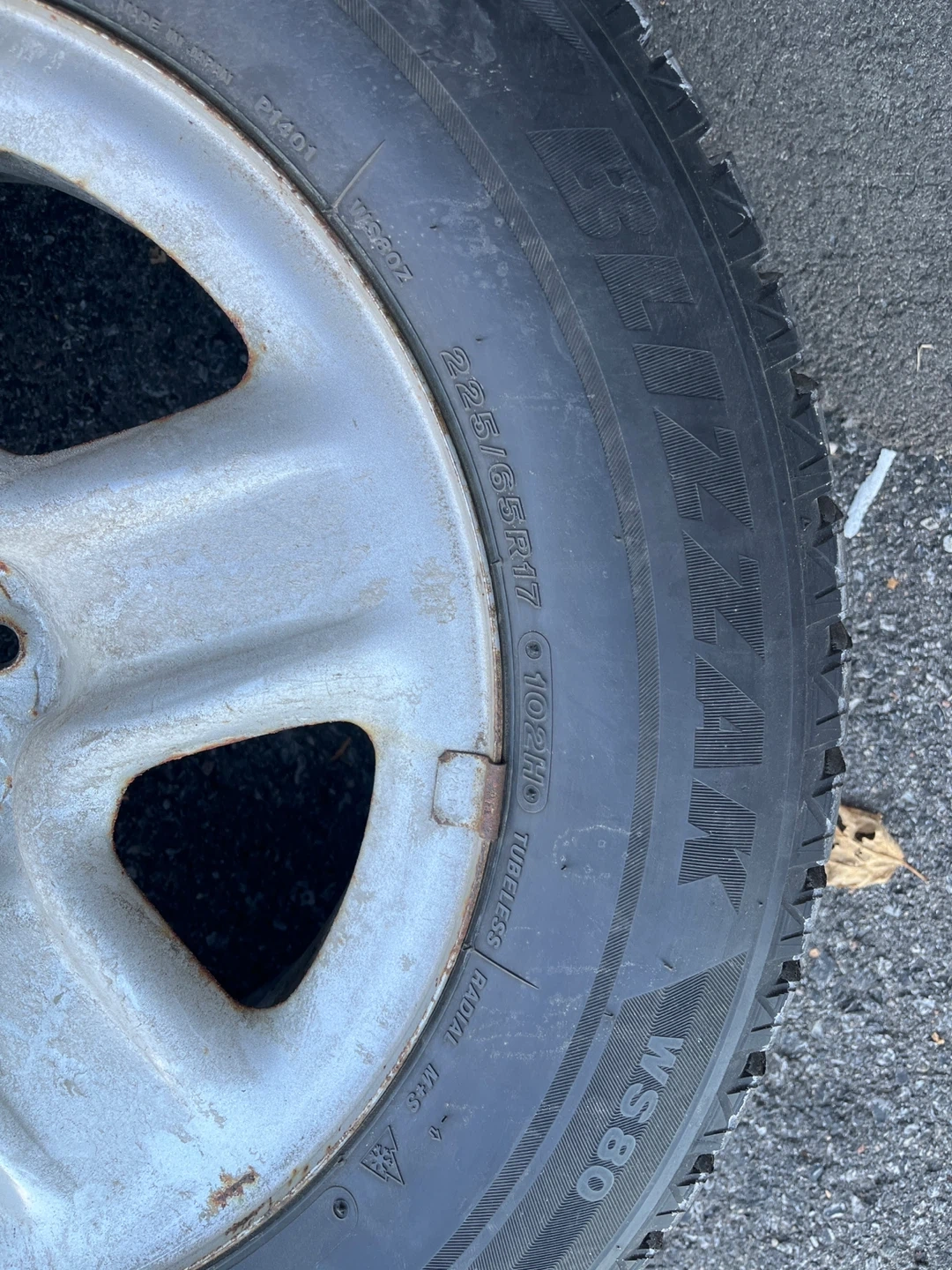 Selling a Bridgestone Blizzak WS80 winter tire. The size is 225/65R17. It's a radial tubeless tire. Great for winter driving! Got tyres brand new from dealership. Used just for 2 - 3 seasons and stored in garage . Had other on my Toyota RAV4 .