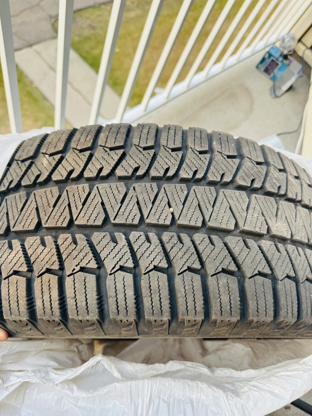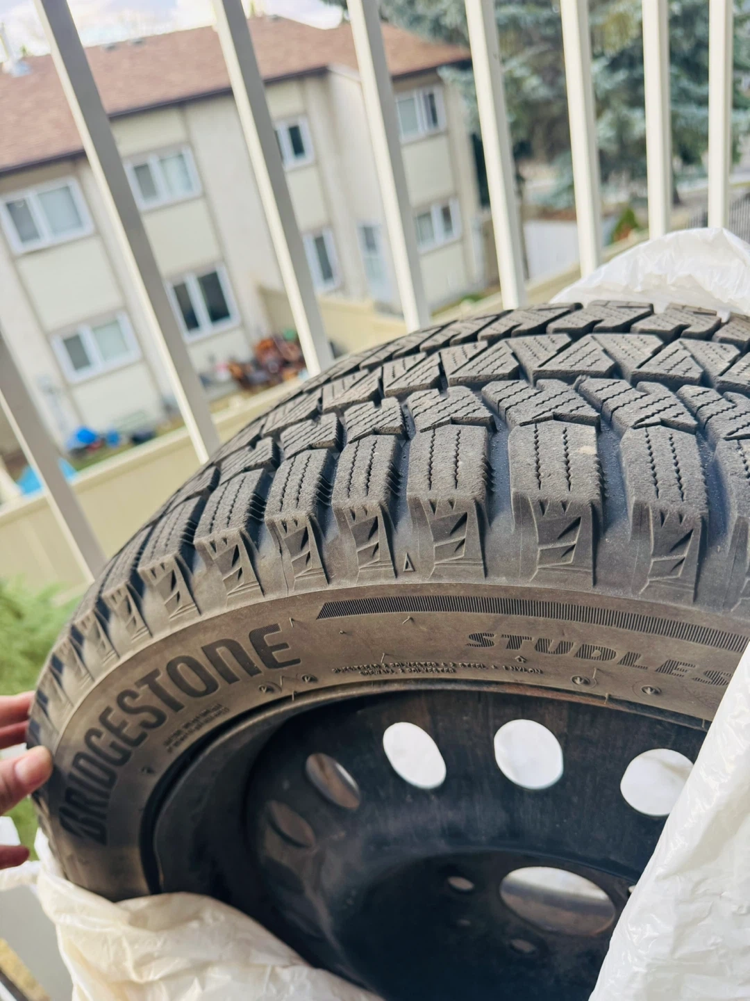65Bridgestone Blizzak Winter Tires with Rims 225/50R17 (Good tread left) Set of 4 Bridgestone Blizzak WS90 winter tires (225/50R17 94H) mounted on steel rims. Excellent tread, Perfect for reliable winter traction and handling. Tire Details: • Brand: Bridgestone • Model: Blizzak WS90 • Size: 225/50R17 94H • Type: Winter / Snow tires • Condition: Lightly used as visible in pictures. • Tread: Excellent (around 80% remaining) Rim Details: • Material: Steel rims • Bolt pattern: 5x114.3 • Rim size: 17 inch • Condition: Very good, no rust or damaged Open for offers