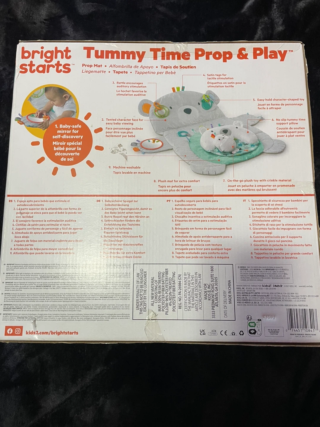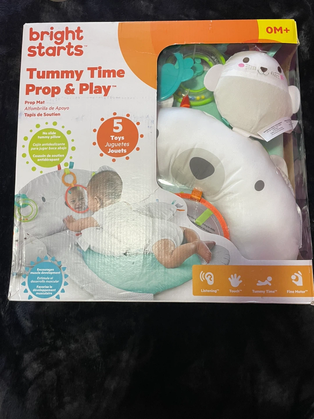 Brand new in box never opened. Get your little one ready for tummy time with this Bright Starts Tummy Time Prop & Play Mat! It includes a baby-safe mirror for self-discovery and 5 toys for fun and development. The mat is machine washable for easy cleaning, and the plush material adds extra comfort. Perfect for encouraging muscle development and sensory exploration!