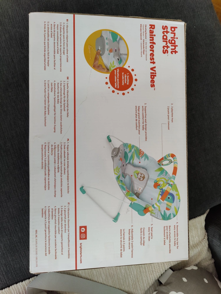 Vibrating bouncer with two toys. Deep seat for extra support. Soothing vibration.