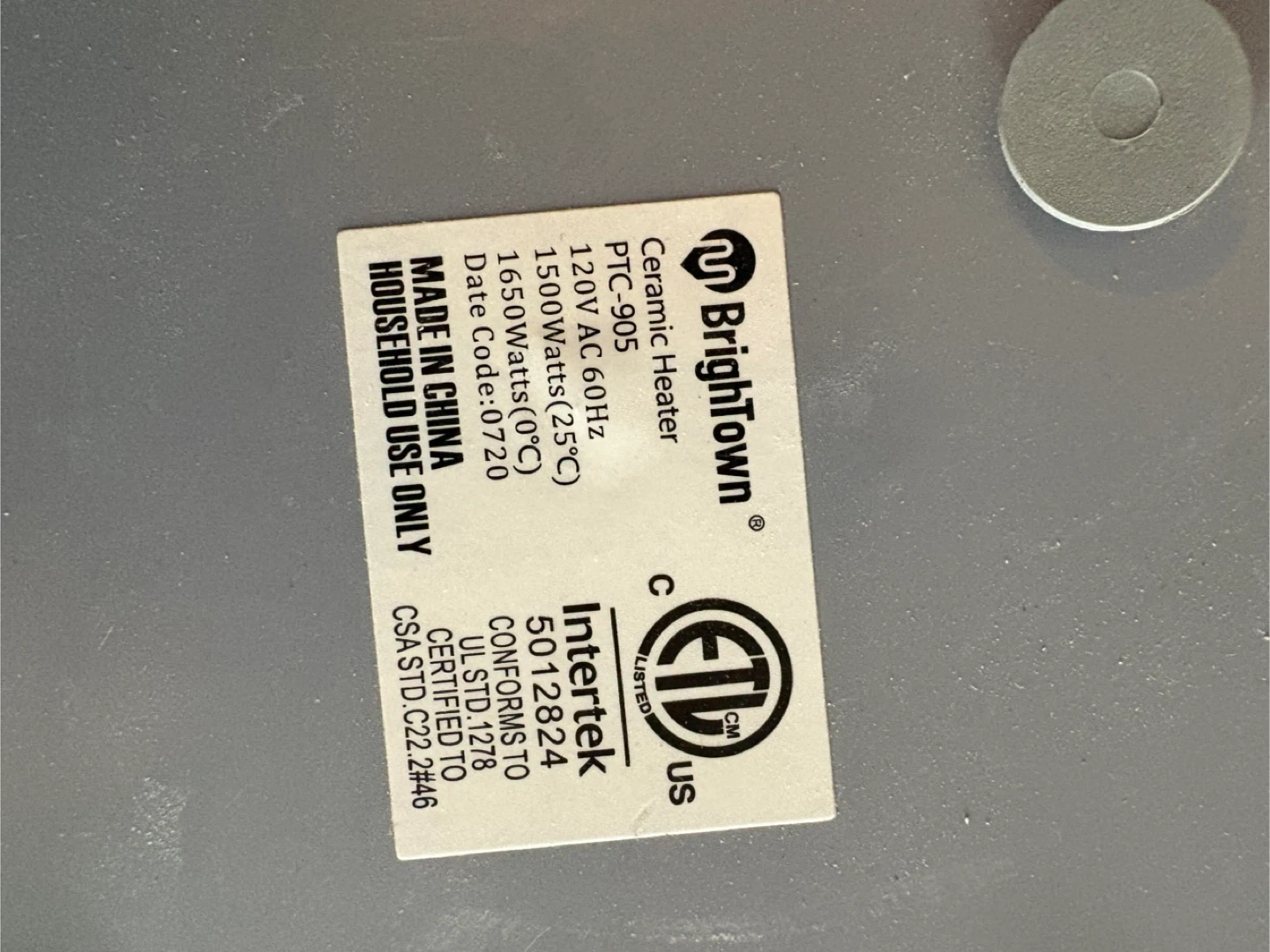 73Selling a BrightTown ceramic heater. It's perfect for household use. The heater is 120V AC 60Hz and has wattage options of 1500W at 25°C or 1650W at 0°C