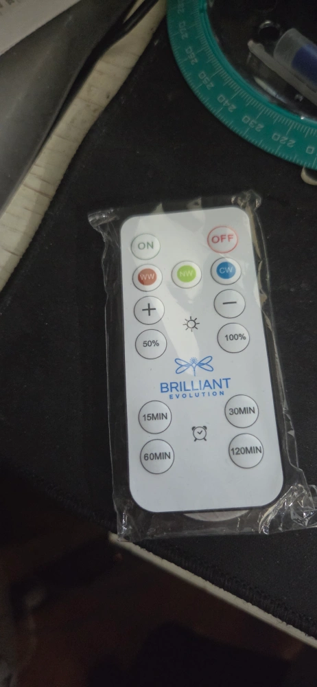 37Selling a remote control for Brilliant Evolution lighting. It's in great condition and ready to use! Control your lights with ease using features like on/off, warm white (WW), neutral white (NW), cool white (CW), brightness adjustment (50%, 100%), and timer settings (15min, 30min, 60min, 120min)