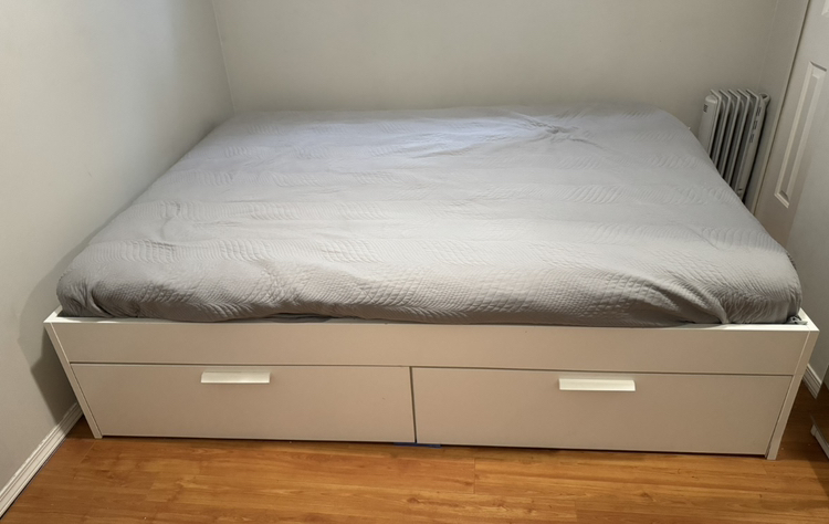 62This stylish and functional bed frame is a popular style at Ikea that comes complete with slats and drawers, offering both comfort and storage solutions. Perfect for maximizing your space! **Features:** - Queen-sized bed frame - Includes slats for mattress support - Drawers for convenient storage - Easy to transport - disassembled for your convenience - One drawer is missing the bottom, but still functional; can easily replace bottom from hardware store - Scuffs in unnoticed areas that doesn’t effect structure $180 **Negotiable for Prompt Pickup!** 📍 East Vancouver Pick Up *Serious inquiries only. First come, first served.