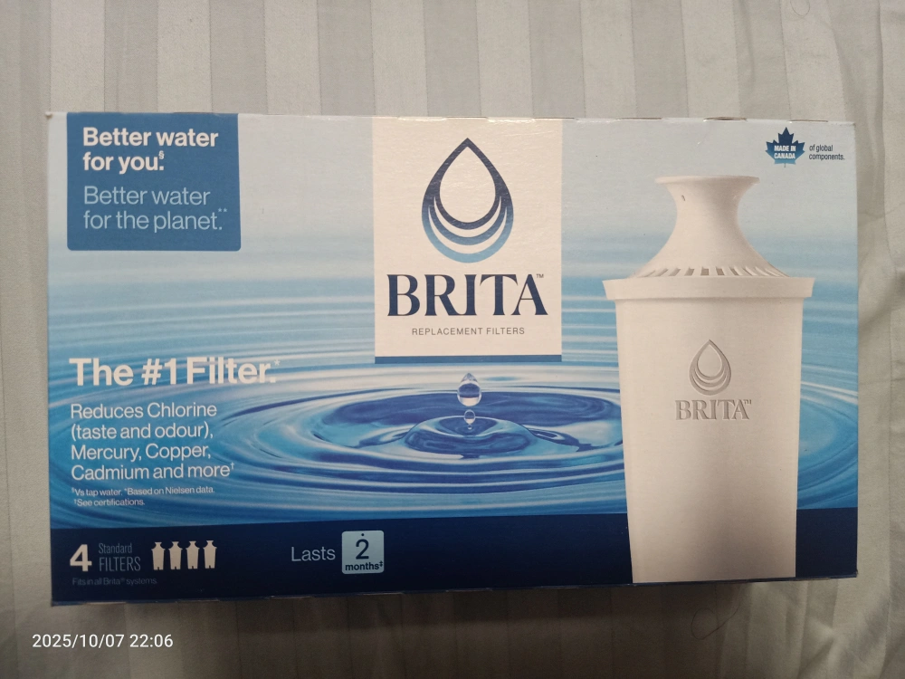 10Get better water for you and the planet with these Brita replacement filters! This pack contains 4 standard filters that fit in all Brita systems. They reduce chlorine (taste and odour), mercury, copper, cadmium and more.