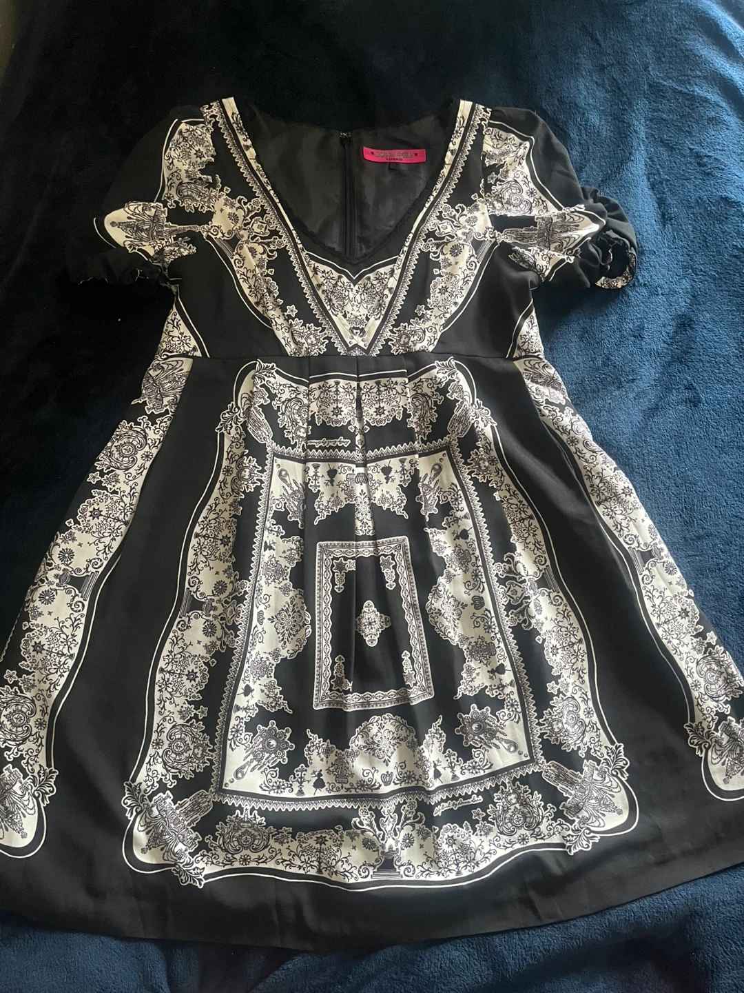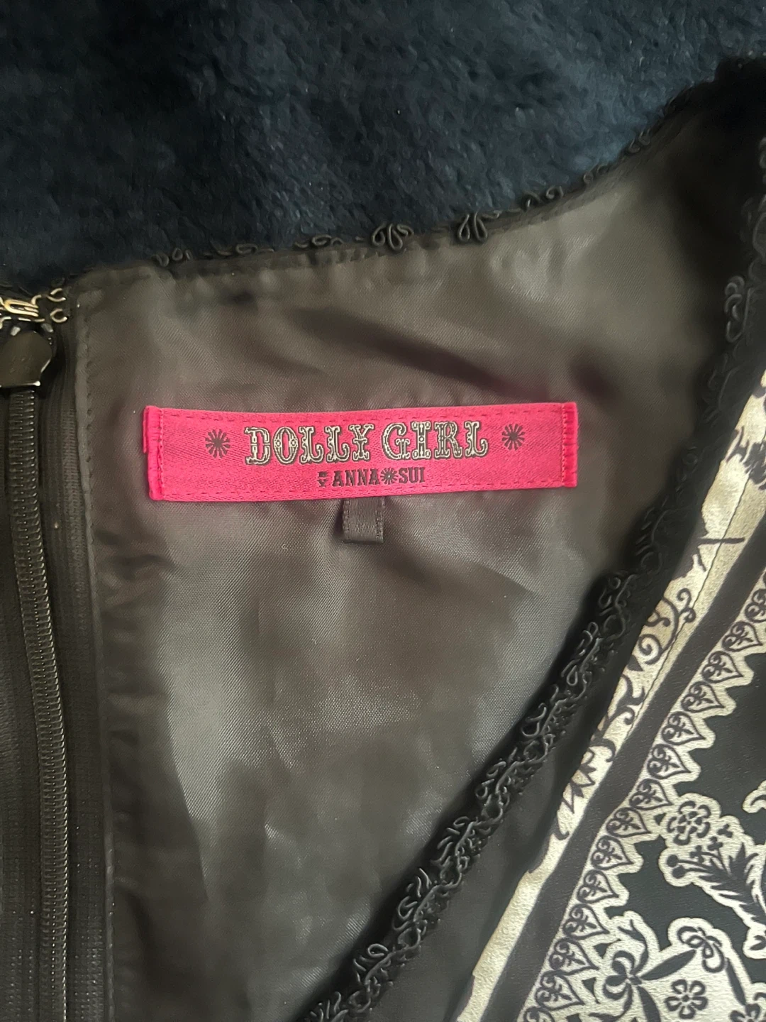 This is a black and white patterned dress from Anna Sui's Dolly Girl line. It features a V-neck and short sleeves. The fabric feels like a polyester blend. Side pockets Bought in Japan for $200+