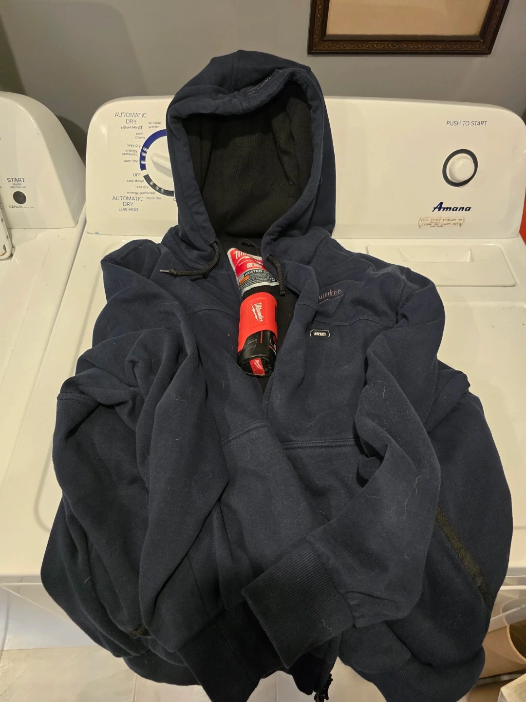 This is a navy blue Milwaukee M12 heated jacket. It's a size large and made from fleece material. The jacket features a full zip front and a hood. NO CHARGER