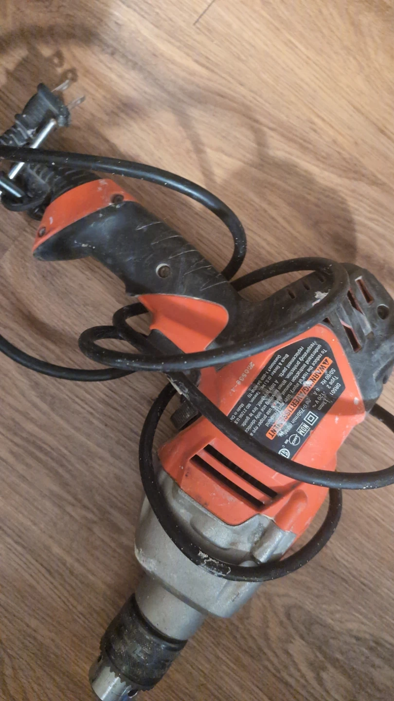 This is a Black & Decker DR501 corded drill. It has a 120V power rating and a 6A current draw. The drill operates at speeds of 0-750 RPM and accepts 13mm bits. It's made in China. Chuck key included