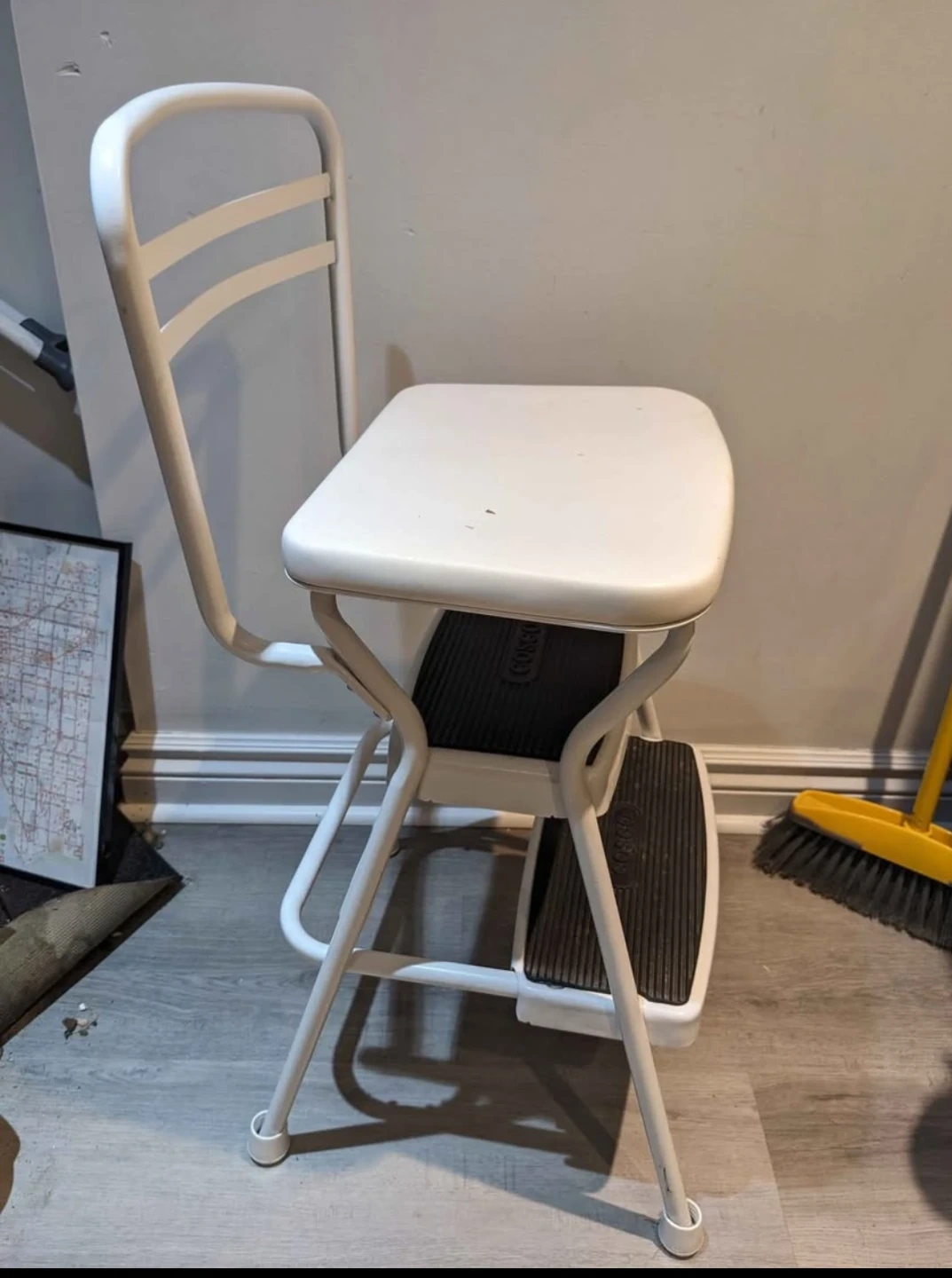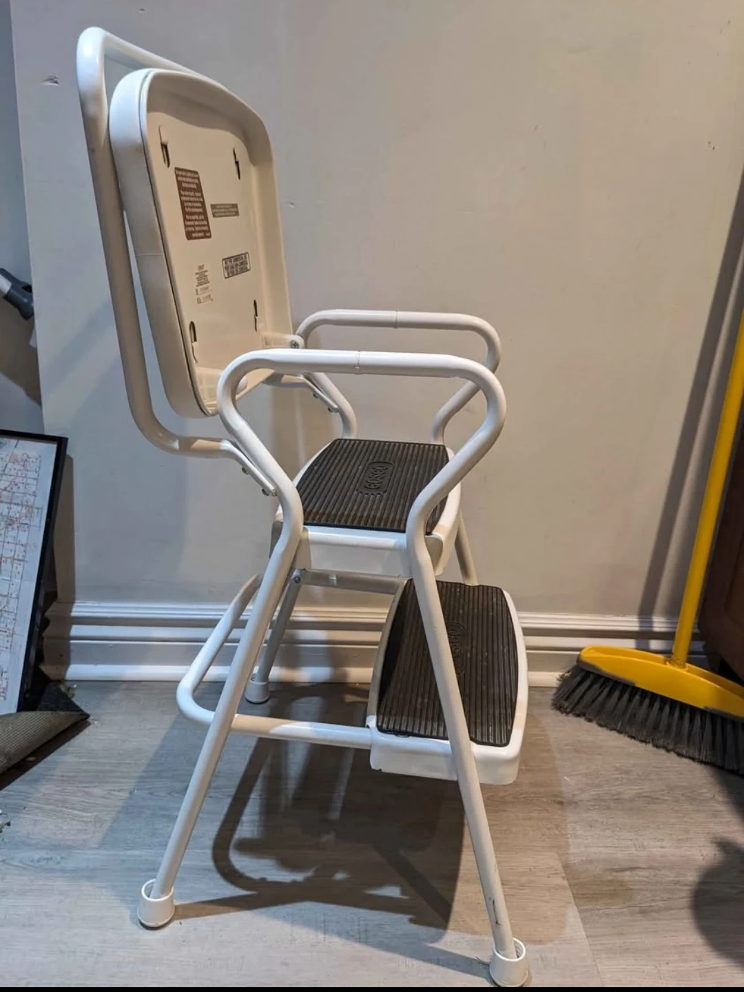 Conveniently helpful chair whose top flips up to reveal a sturdy stepstool! It's been used in a kitchen to reach high cupboards and to sit at the counter, and in an art studio at a drafting table and to reach the tops of bookshelves.