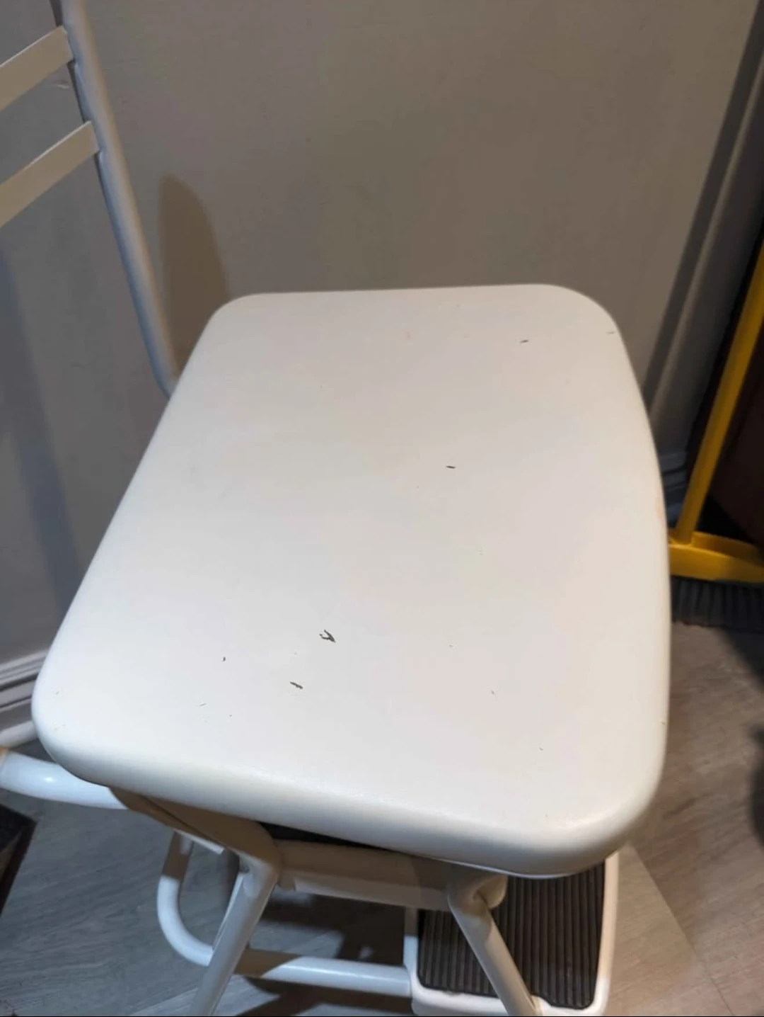 Has some small holes in the pleather from a cat and slight paint discolouration, so could do with a simple tie-on cushion or cover. Has additional rubber feet to protect floors!