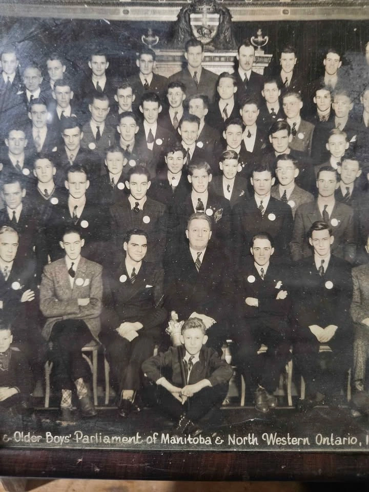 This youth parliamentary program brought boys from across Manitoba and Northwestern Ontario to participate in a mock parliament held in the Manitoba Legislative Building in Winnipeg. The photograph shows dozens of participants and leaders gathered beneath the Manitoba coat of arms inside the legislative chamber.