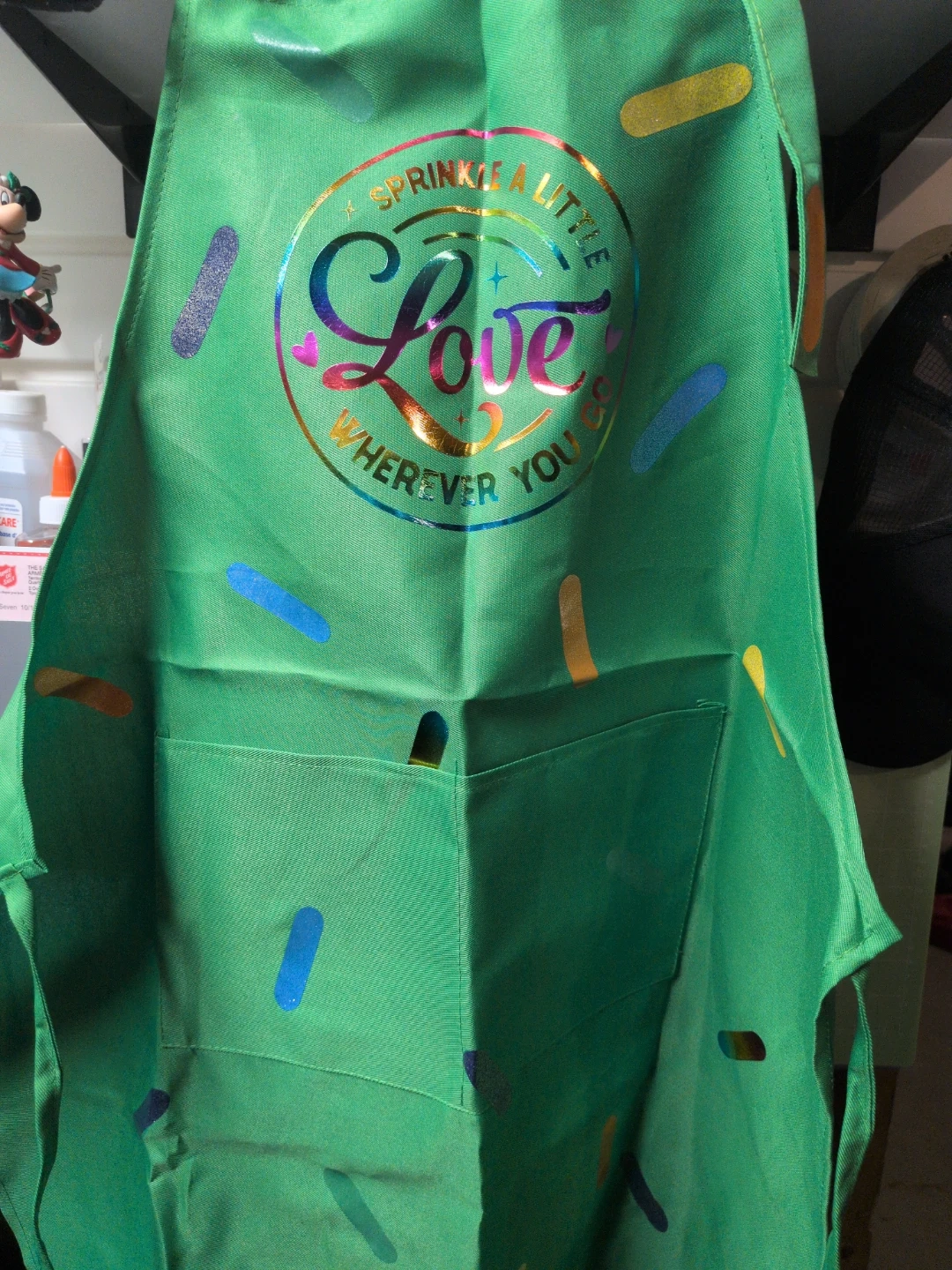 Here's a custom made fun teen/adult green apron with a colourful 'Sprinkle a Little Love Wherever You Go' with sprinkles design! Brand new ready for a home.