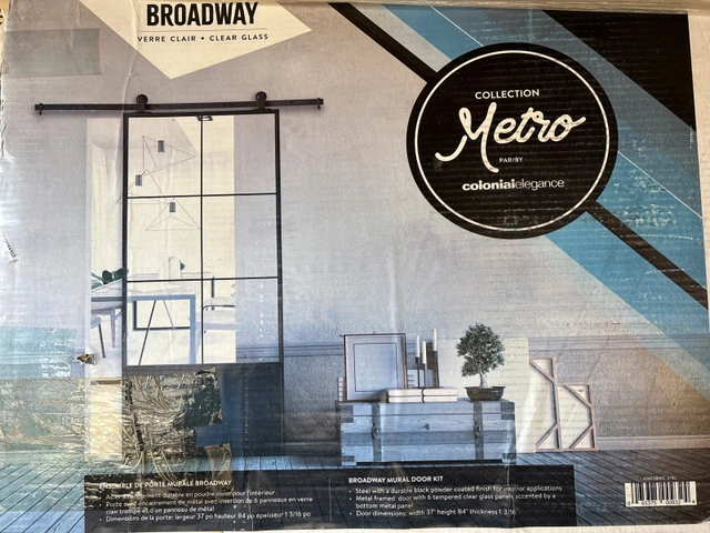 97New Broadway Metro barn door. It has a sleek steel frame and six tempered clear glass panels accented by a bottom metal panel, and is designed for interior applications. The door's dimensions are 37" wide, 84" high, and 1 3/16" thick. Key features include: * Steel with a durable black powder-coated finish * Metal-framed door with 6 tempered clear glass panels * Door dimensions: 37" width x 84" height x 1 3/16" thickness If the ad is up, it's still available!