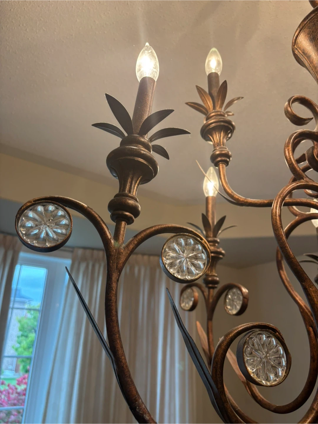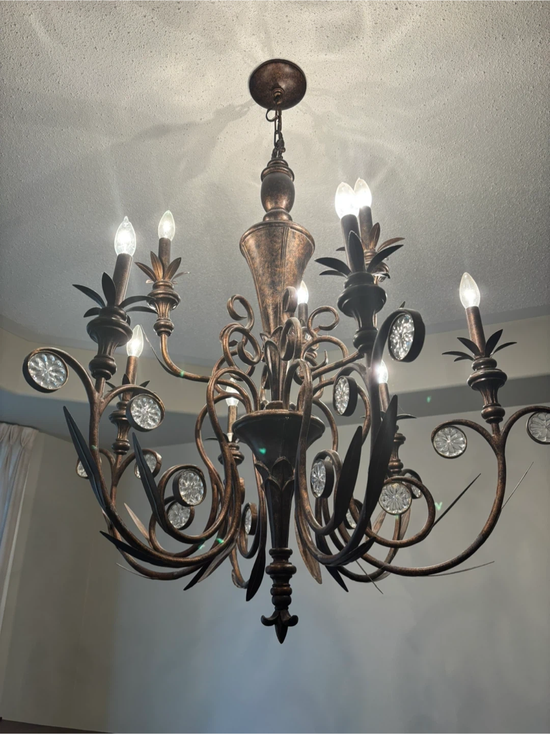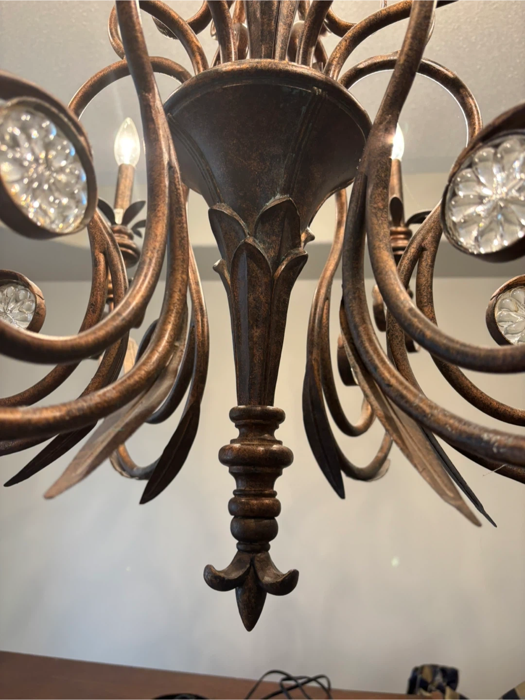131Beautiful chandelier with a wrought iron finish and lovely crystal accents. It's in great condition and would add a touch of elegance to any room!