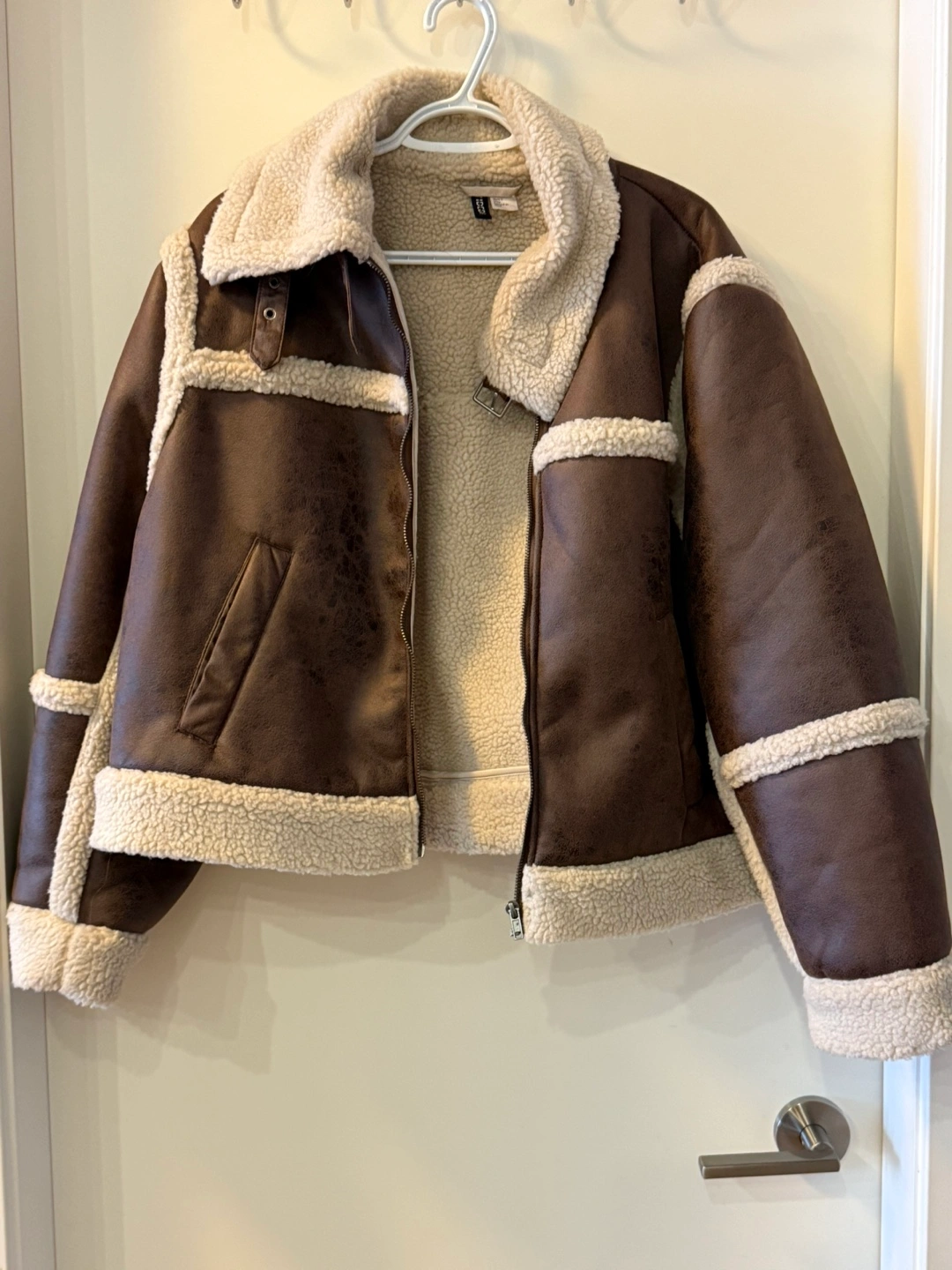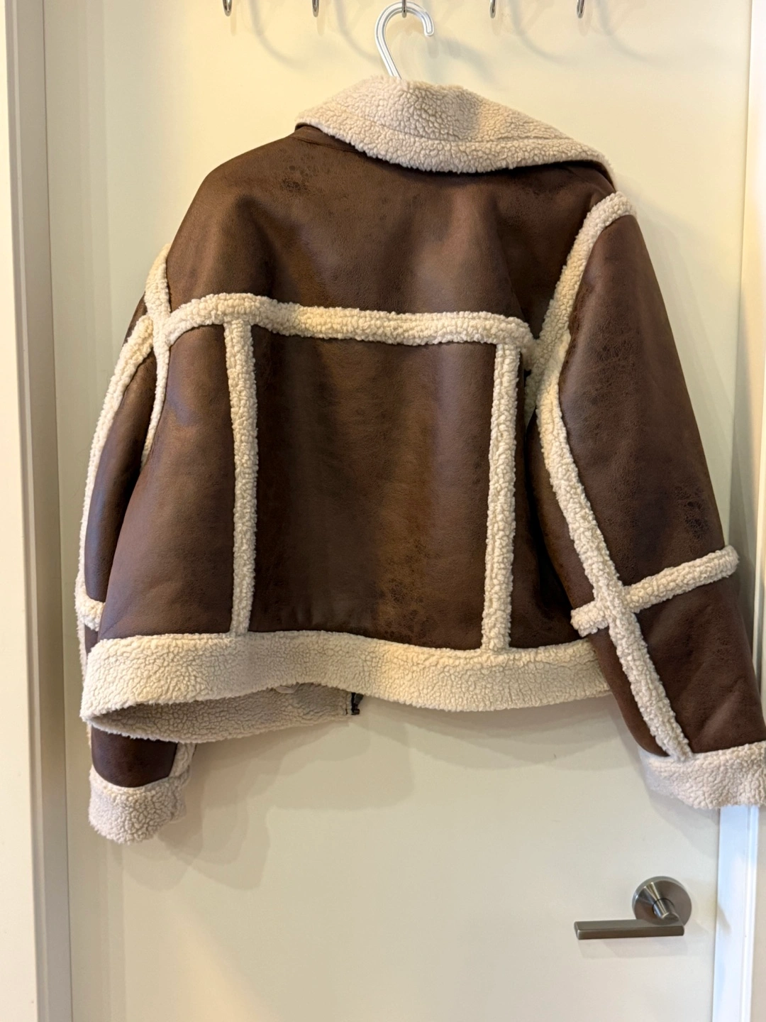 10Stylish jacket. Brown faux leather exterior. Cream coloured sherpa interior. Colour block design. Zip closure. Size extra large.