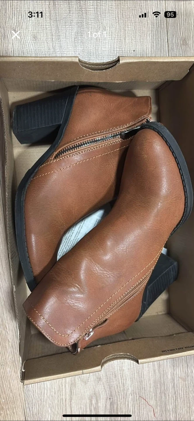 15Selling a pair of brown ankle boots with a block heel. They have a zipper closure on the side. Comes with the original box!