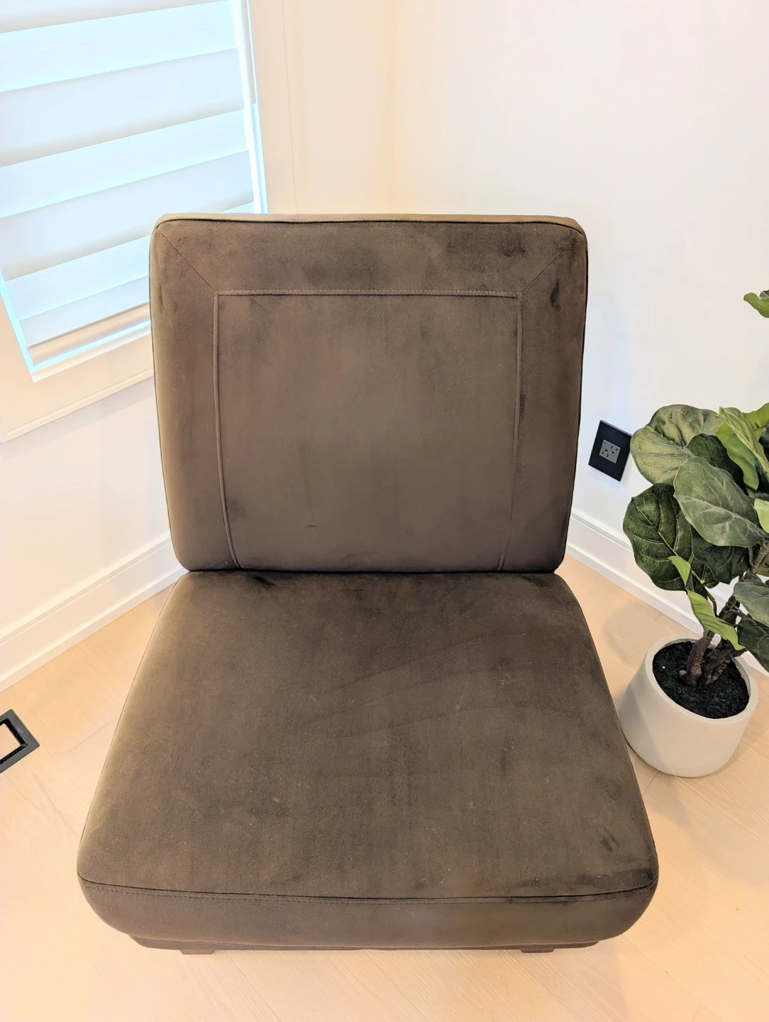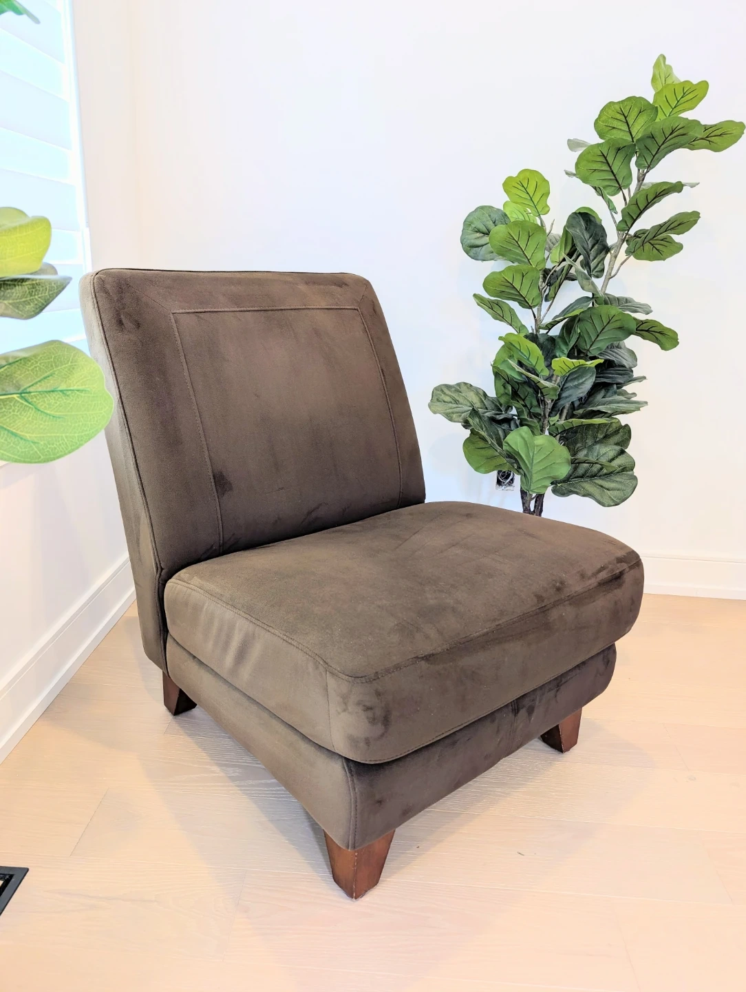 18Selling a comfy brown armless accent chair! It's in great shape and would be perfect for your living room or bedroom! Has excellent velvet fabric, easy to maintain. Approximate dimensions: 35 Inch depth 30 inch width 19 inch Seating height 37 inch total height