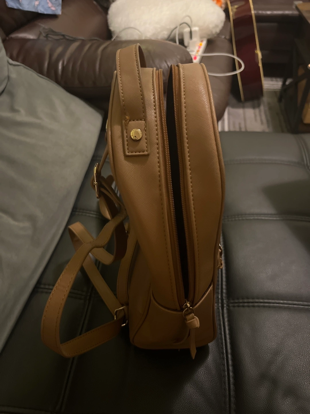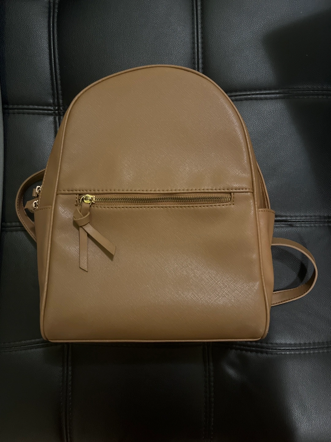 Selling a cute brown backpack! It's in great condition and perfect for everyday use. It has a zippered front pocket and adjustable straps