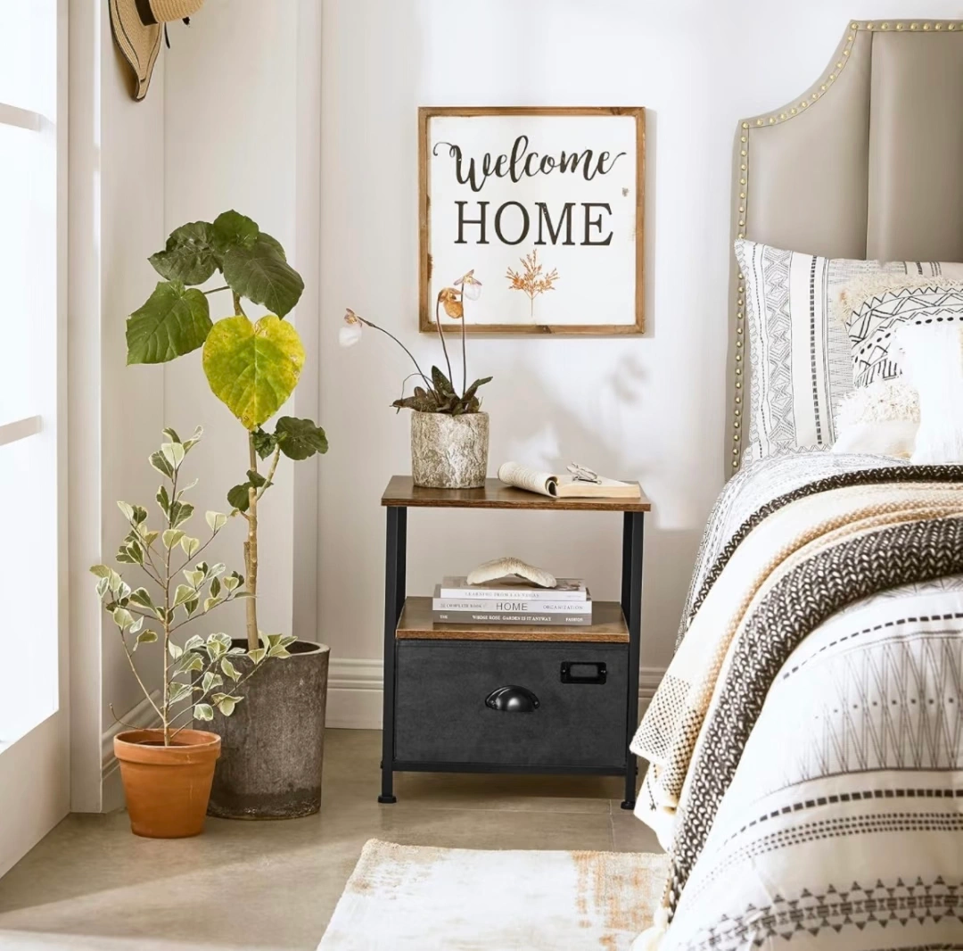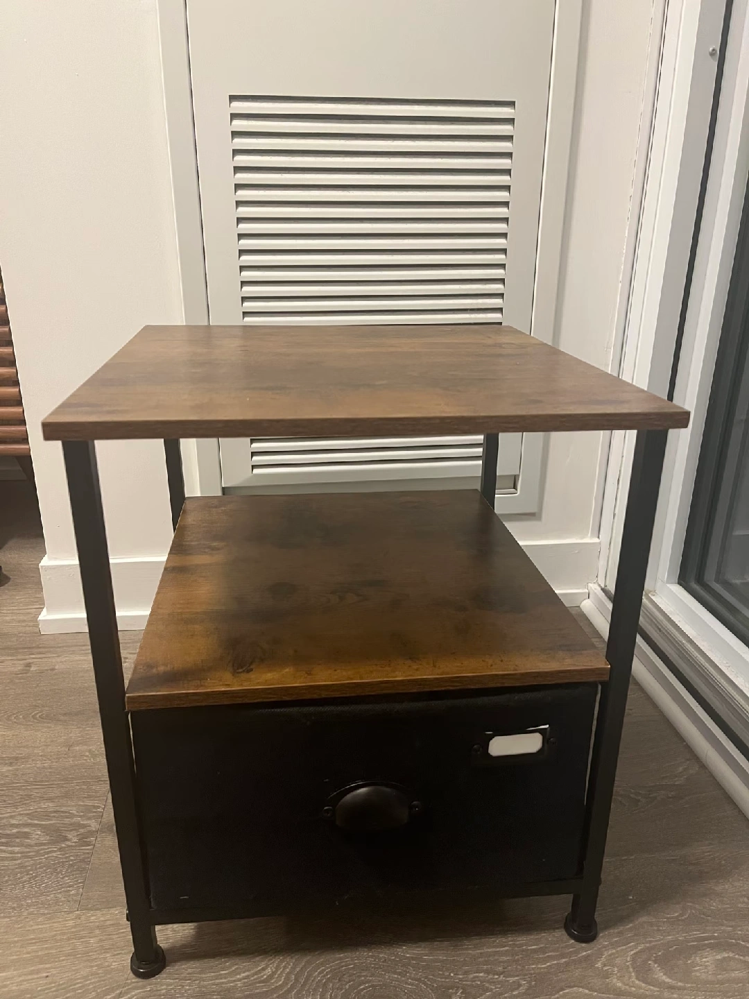 This nightstand features a rustic brown top and a black drawer for storage. It’s a great size for beside a bed or sofa. The dimensions are approximately 16.1" x 16.1" x 18.5". It also has adjustable feet to keep it balanced on slightly uneven floors