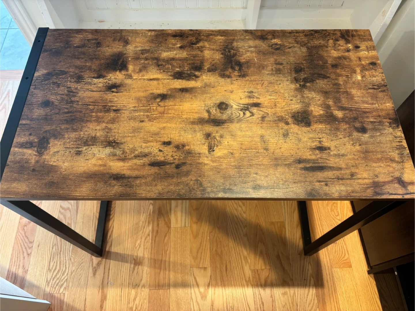 202Selling a small desk with a wooden-look top and black metal legs. It measures approximately 36 inches in length and 20 inches in width, perfect for a small space or home office. Available for pickup and delivery