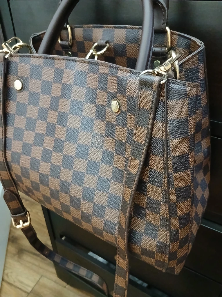 25Selling a cute brown checkered satchel handbag! It's in great condition and features a top handle and a detachable shoulder strap. Perfect for everyday use or a night out