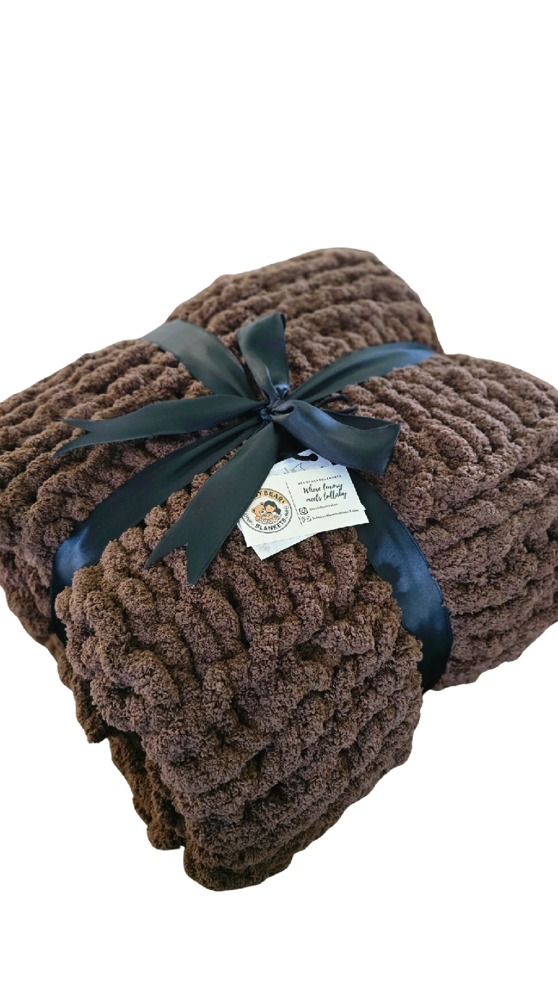 Here’s a cozy brown handmade chunky knit blanket! It’s super soft and perfect for snuggling up on the couch or adding a warm touch to any room. 43x70