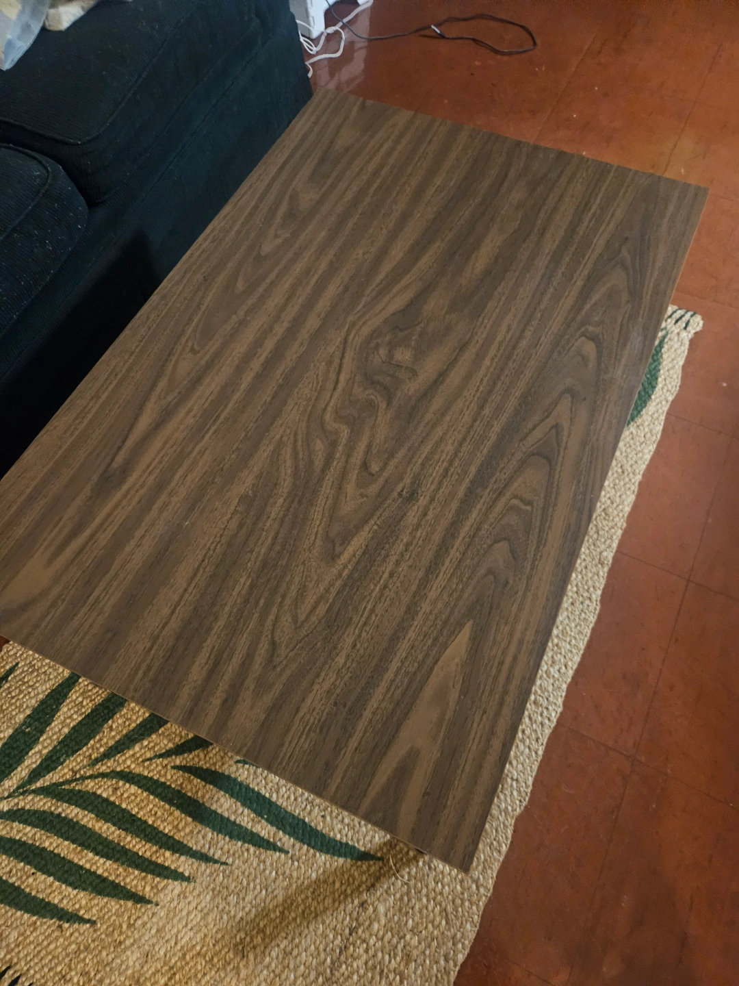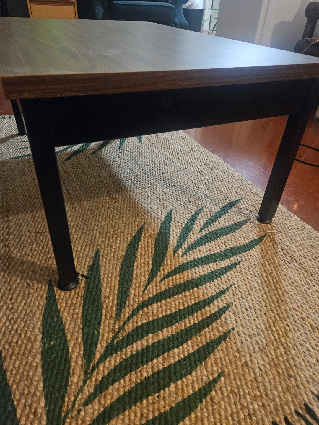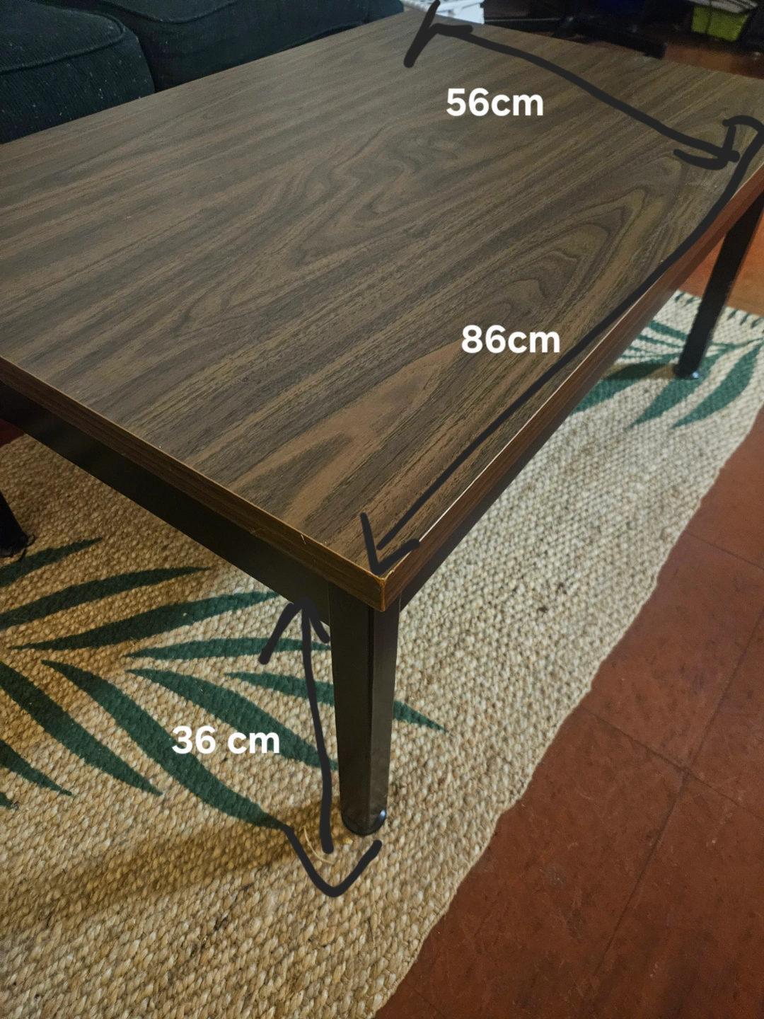 76Moving sale Dark brown wood coffee table with black metal legs. Dimensions: 86cm L x 56cm W x 36cm H. Simple design. Great for a small space. Used but in good condition $20 obo. Pick up only and cash preferred