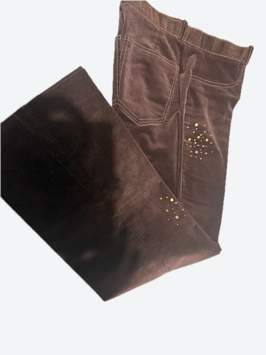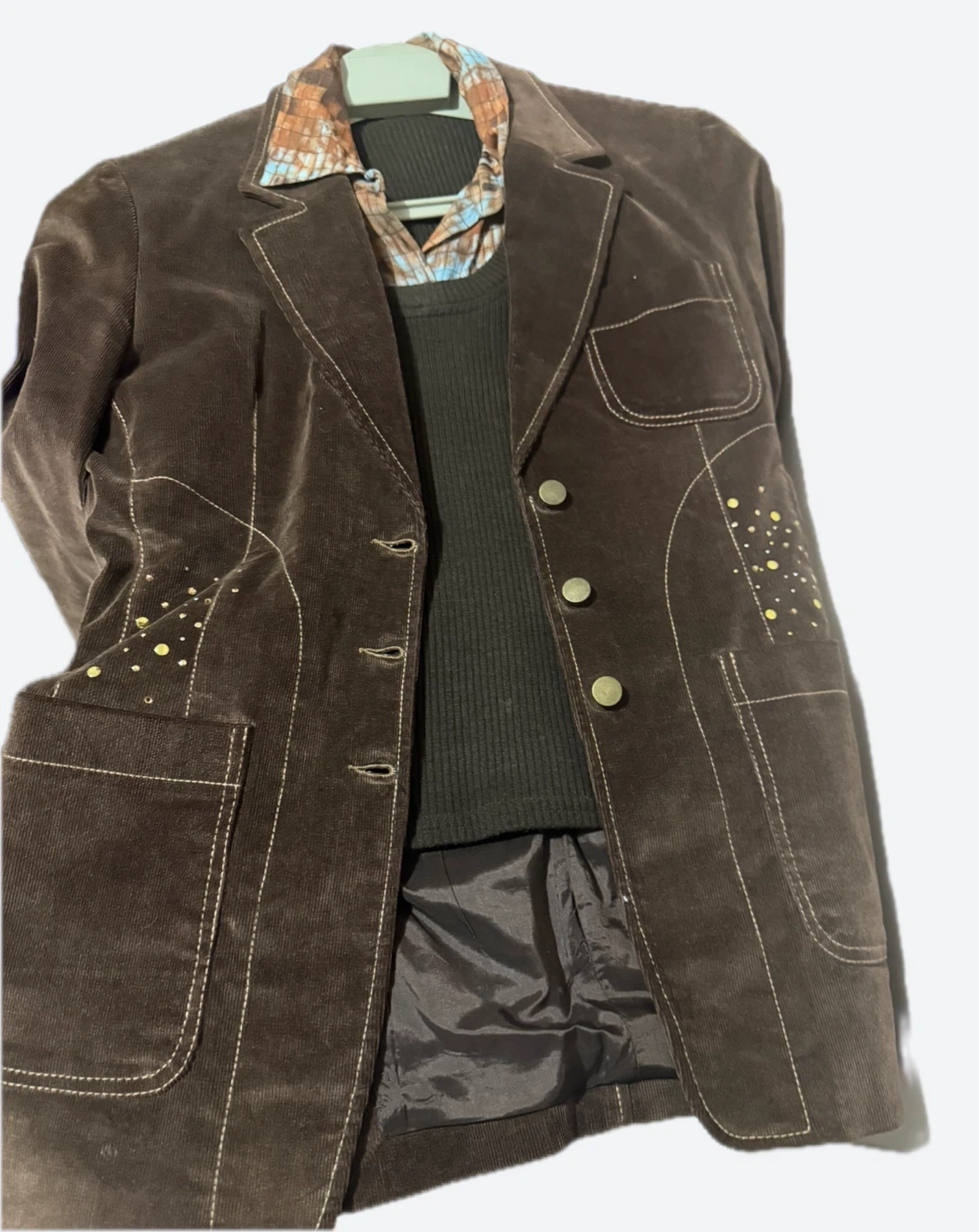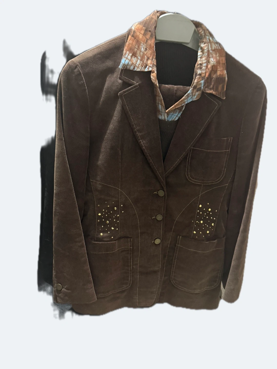 Selling a stylish brown corduroy blazer and pants set! The blazer features unique stitching and small gold embellishments on the pockets. The pants have a similar design, making it a coordinated and fashionable outfit. Perfect for adding a touch of retro flair to your wardrobe!