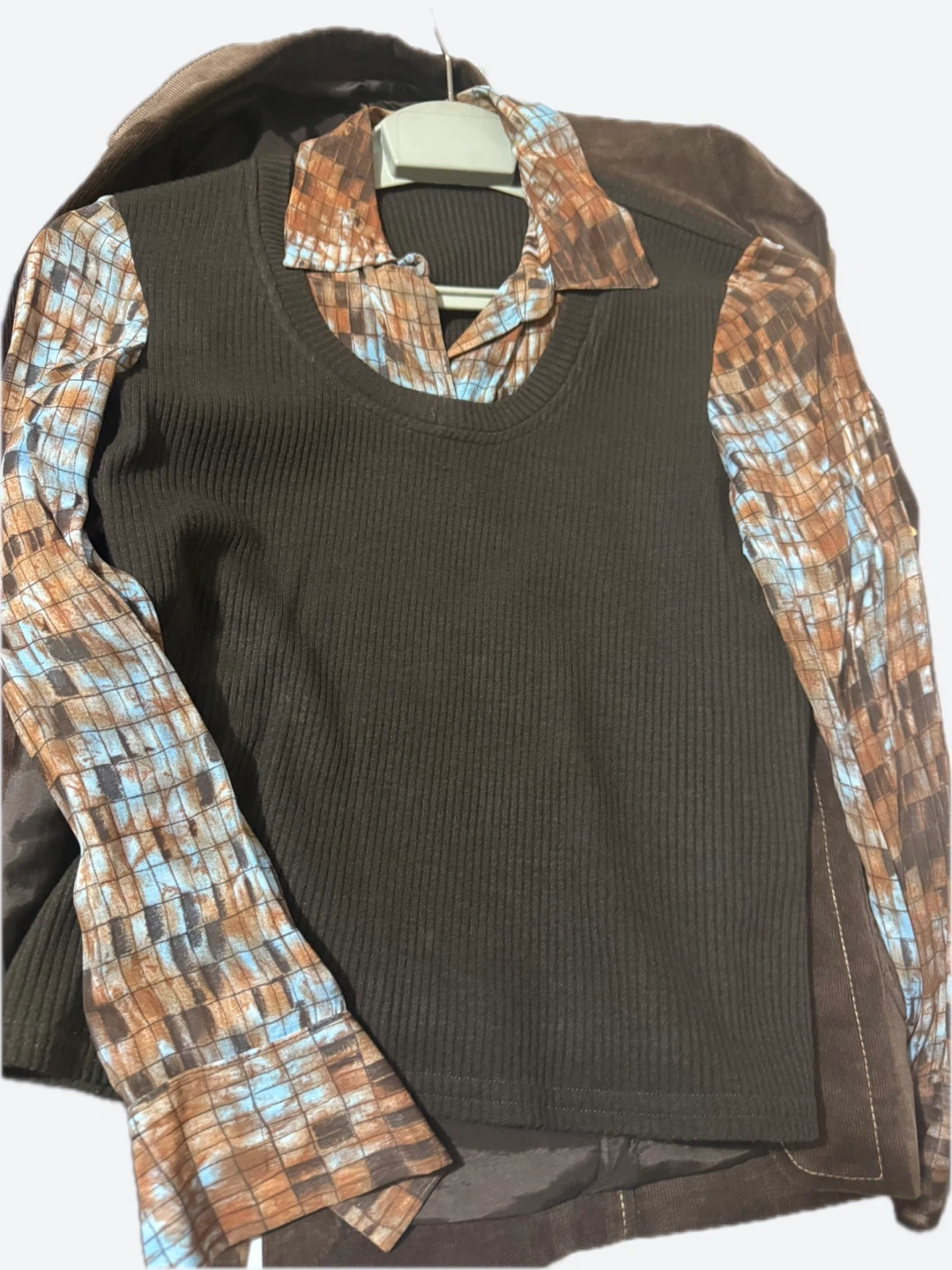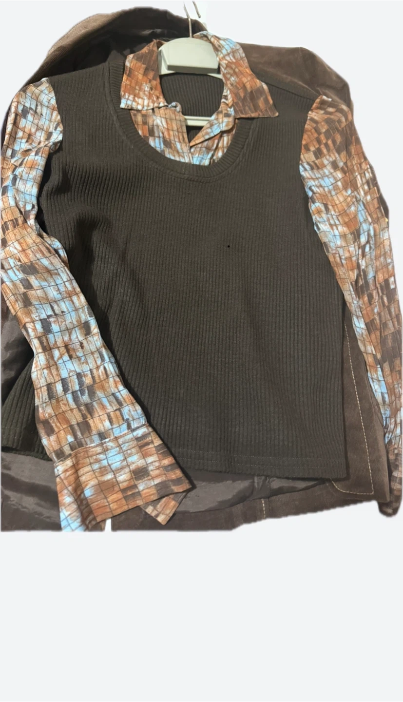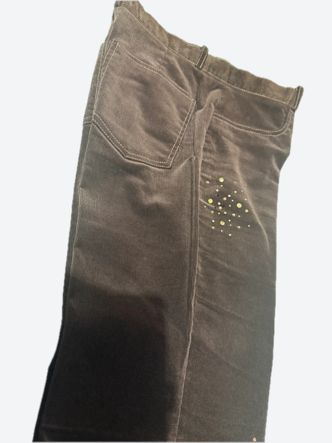Selling a stylish brown corduroy blazer and pants set! The blazer features unique stitching and small gold embellishments on the pockets. The pants have a similar design, making it a coordinated and fashionable outfit. Perfect for adding a touch of retro flair to your wardrobe!