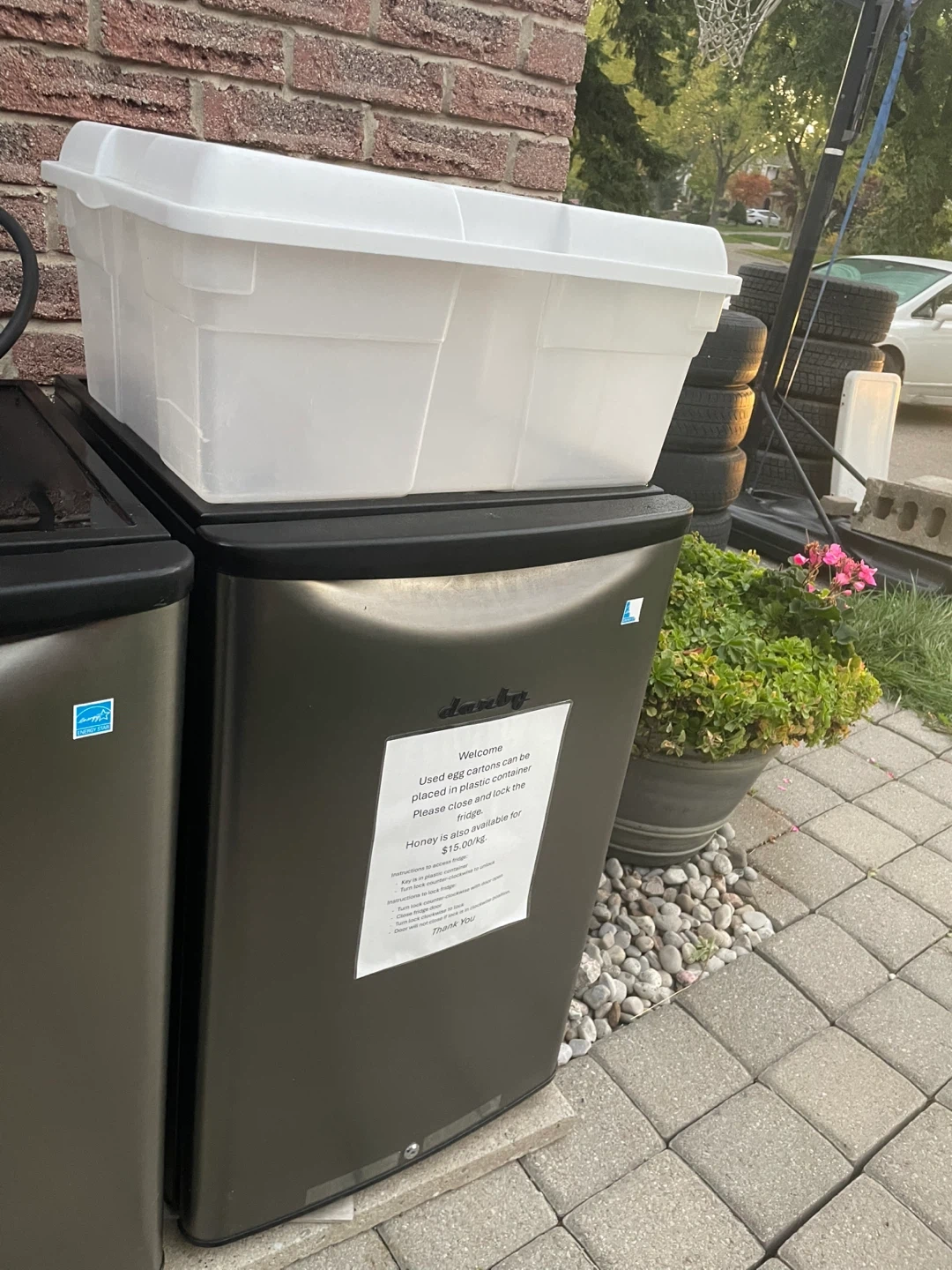 I’ve set up a self-serve egg fridge outside my house in Mississauga. You can pick up eggs from my mom’s farm. Cost is $6.00 per dozen. Please reach out for more information.