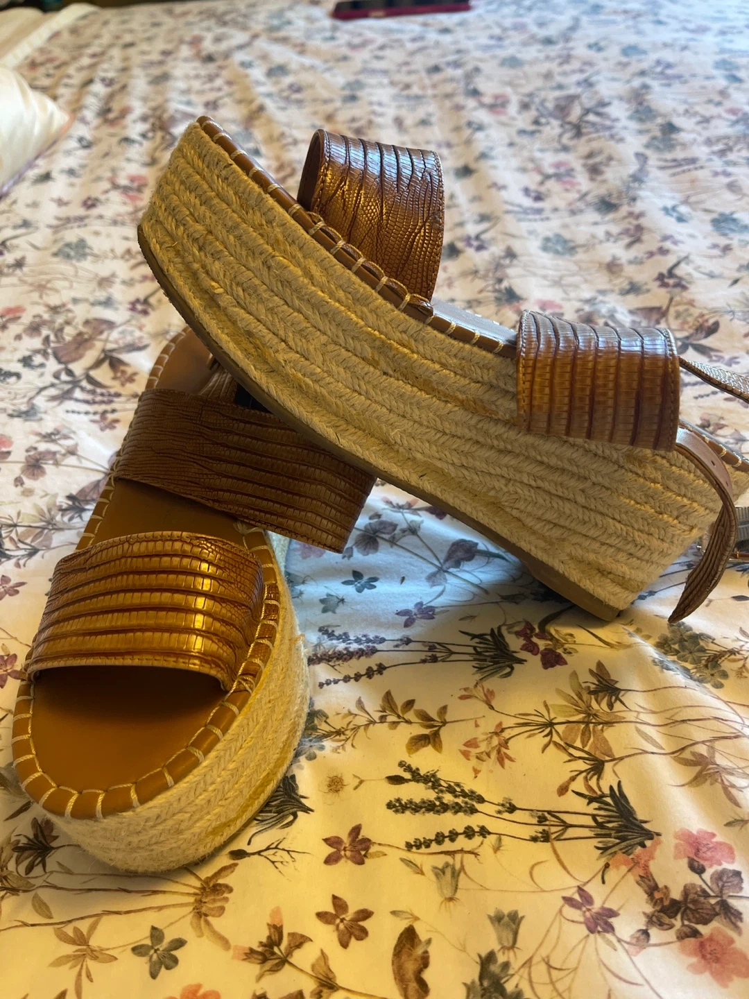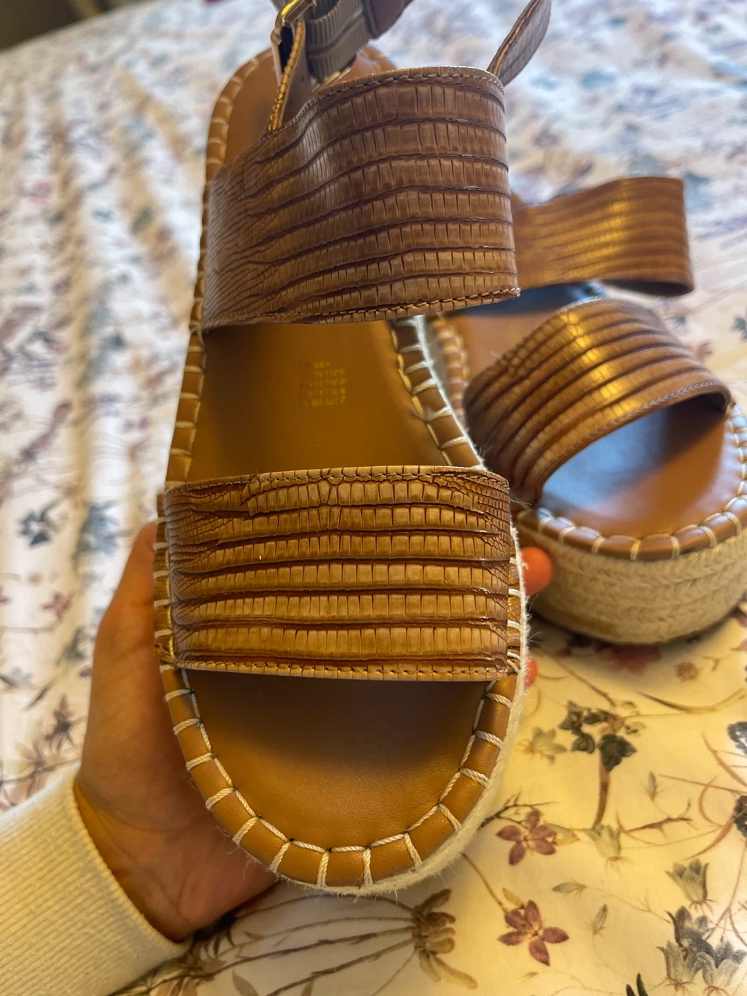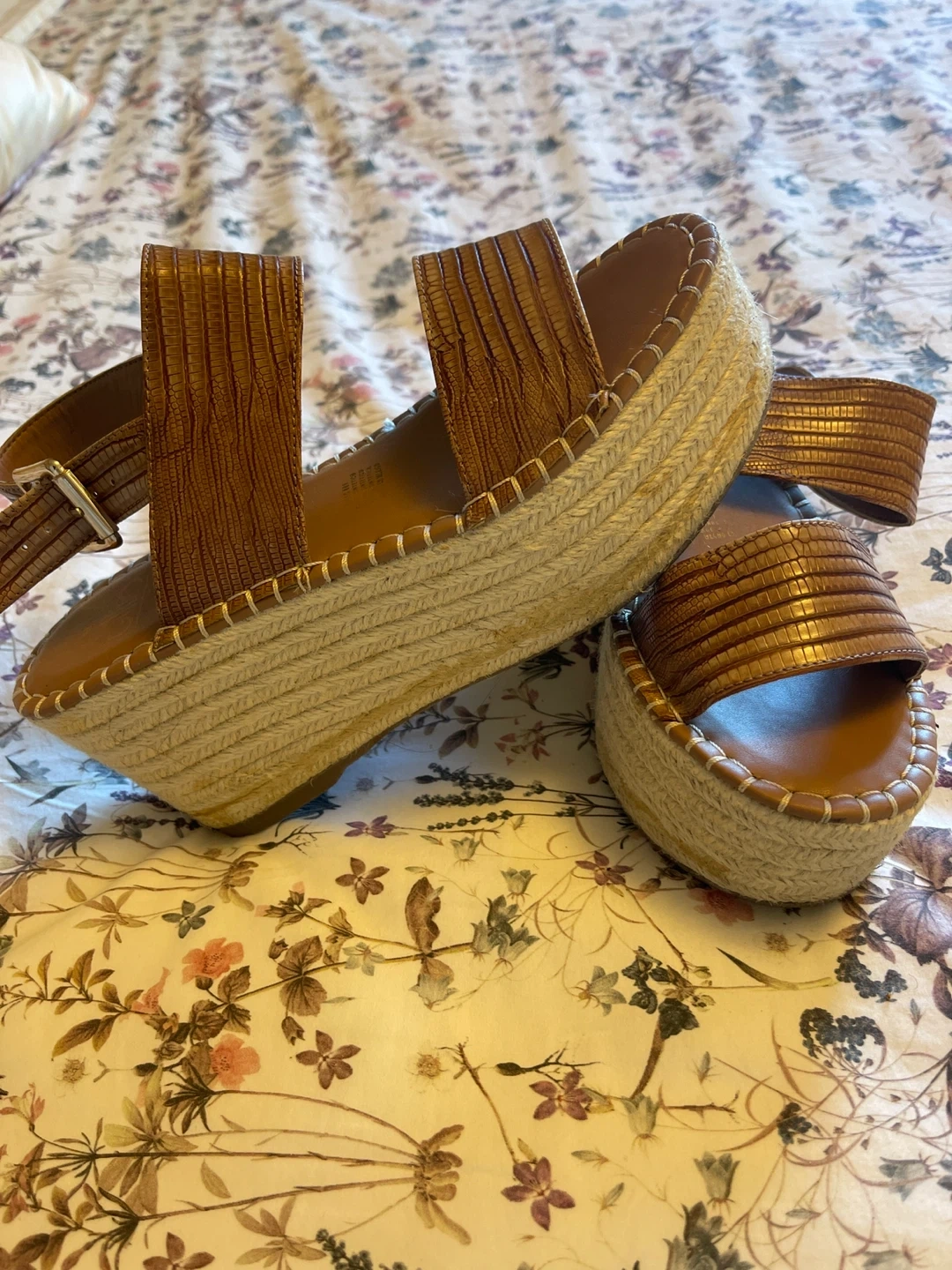 25These are a pair of cute brown espadrille platform sandals! They feature a faux leather reptile print on the straps and a buckle closure. Size 7