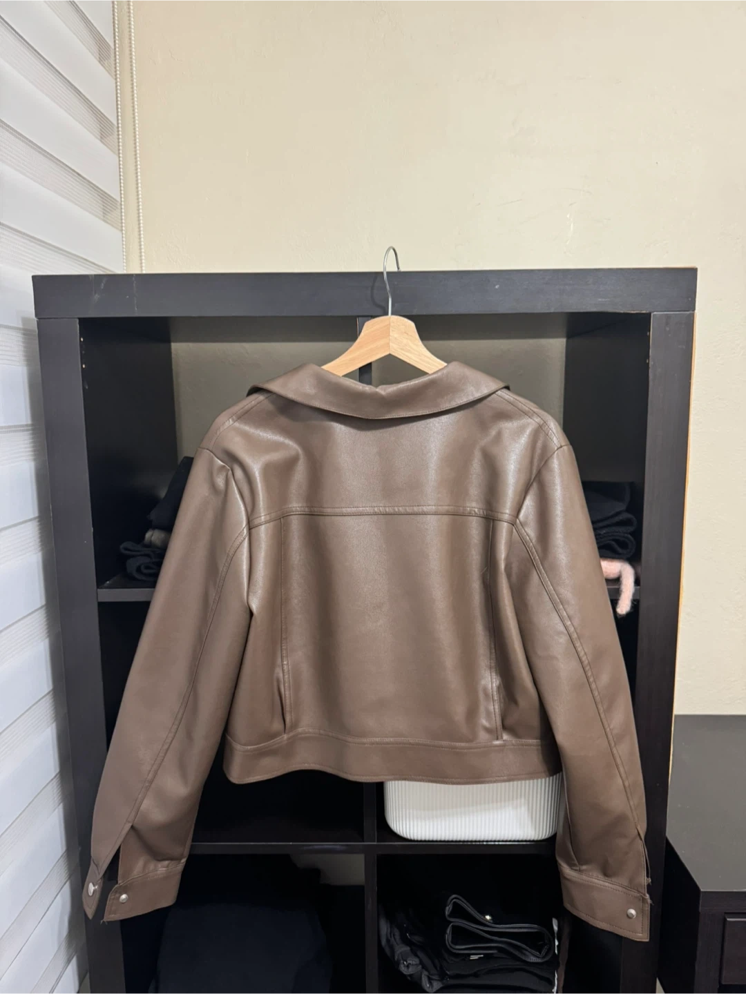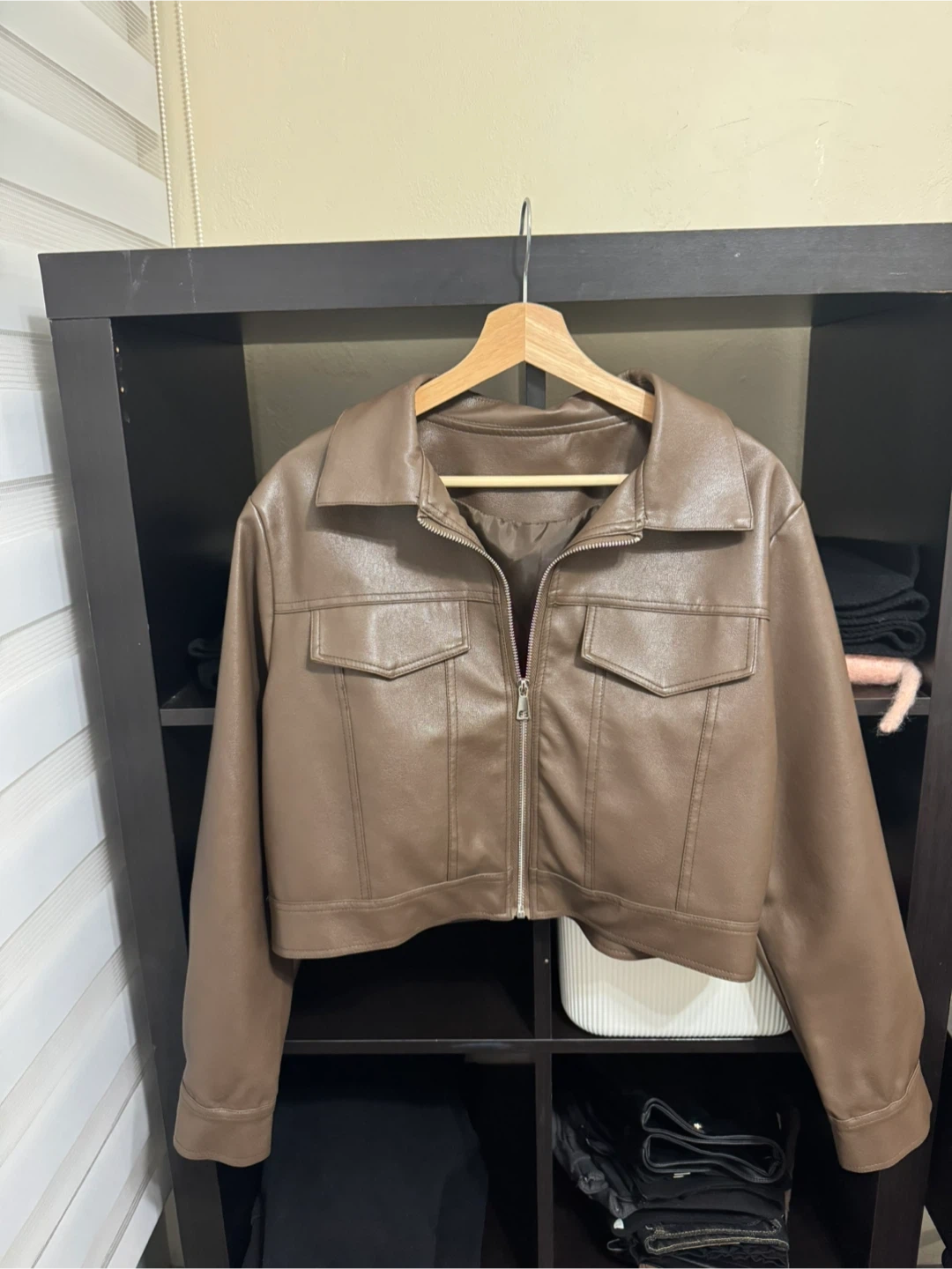 112Selling a stylish brown faux leather cropped jacket! It's in great condition and perfect for adding a bit of edge to any outfit. The jacket features a collared neckline, a zipper closure, and functional pockets. It's a great piece for layering!