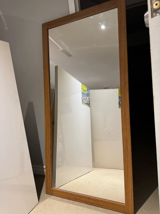 35Stylish brown-framed mirror, perfect for your bathroom above a cupboard or as a statement piece elsewhere. Can be used laterally or vertically. The mirror is quite heavy and requires two people for disassembly and carrying. In excellent condition—durable and elegant for any space. Dimensions (cm): 147 x 71 x 3 (Check my listings for more.)
