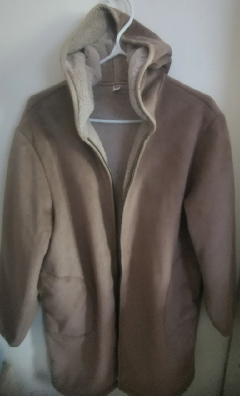 15Cozy brown jacket with a hood! It's made of a soft, faux suede material, perfect for keeping warm on chilly days. It has a comfortable lining and a relaxed fit.