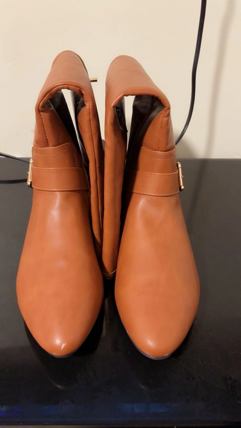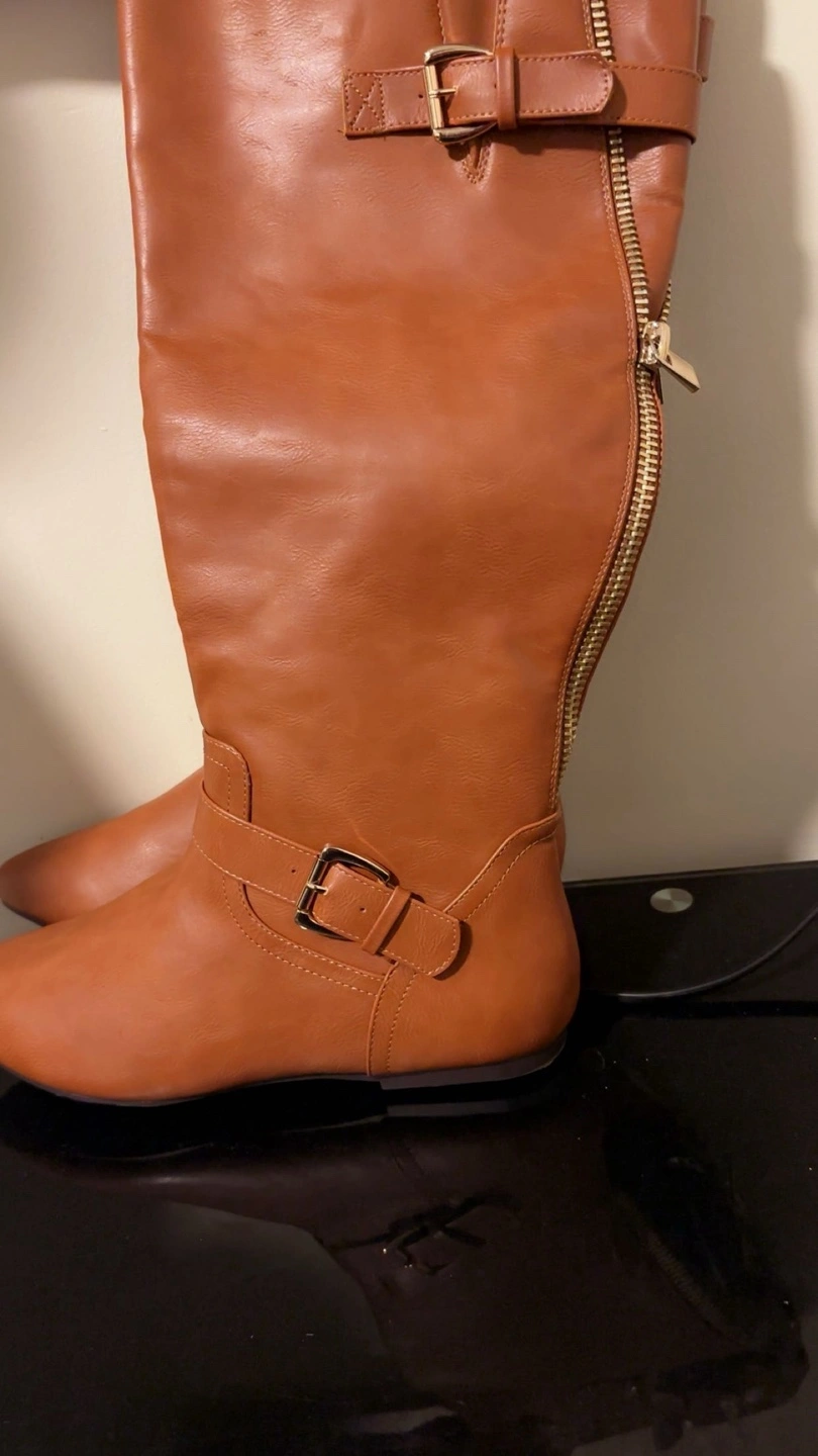 These are a pair of brown knee high boots. They feature a decorative buckle and zipper detail. They are in good condition and ready for a new home!