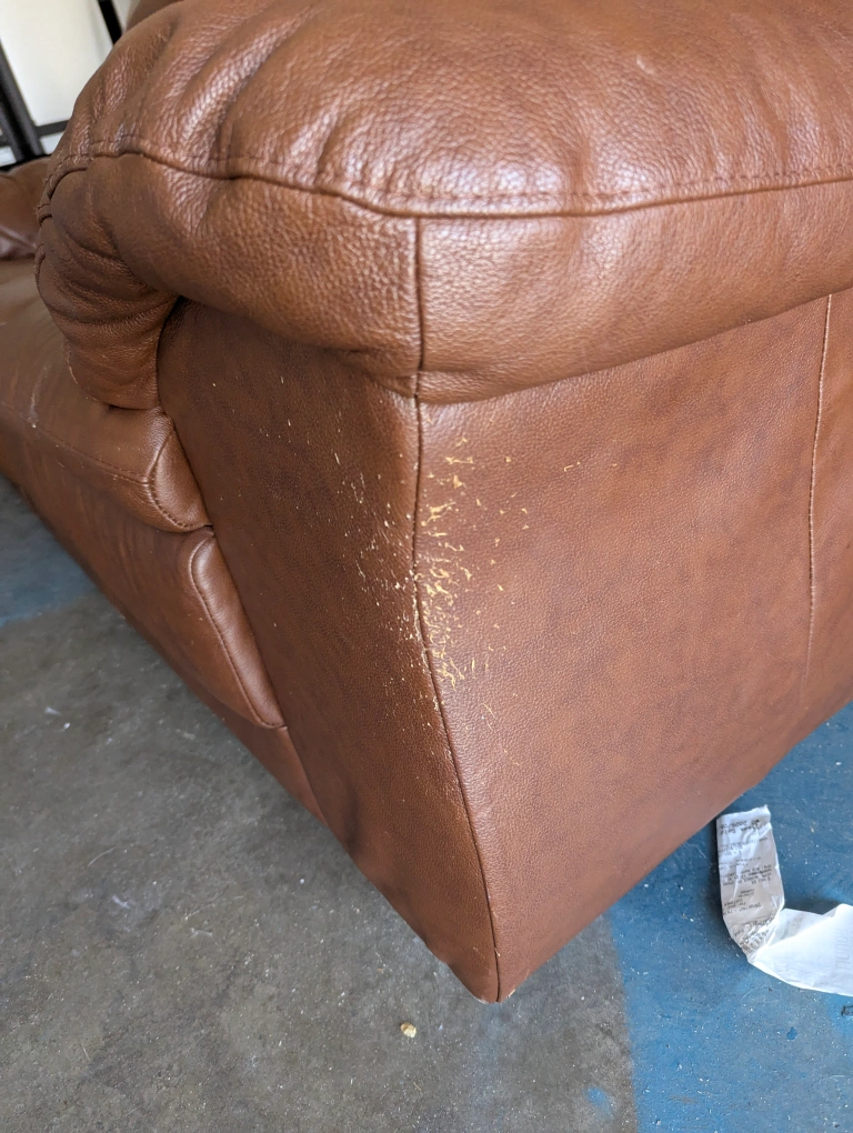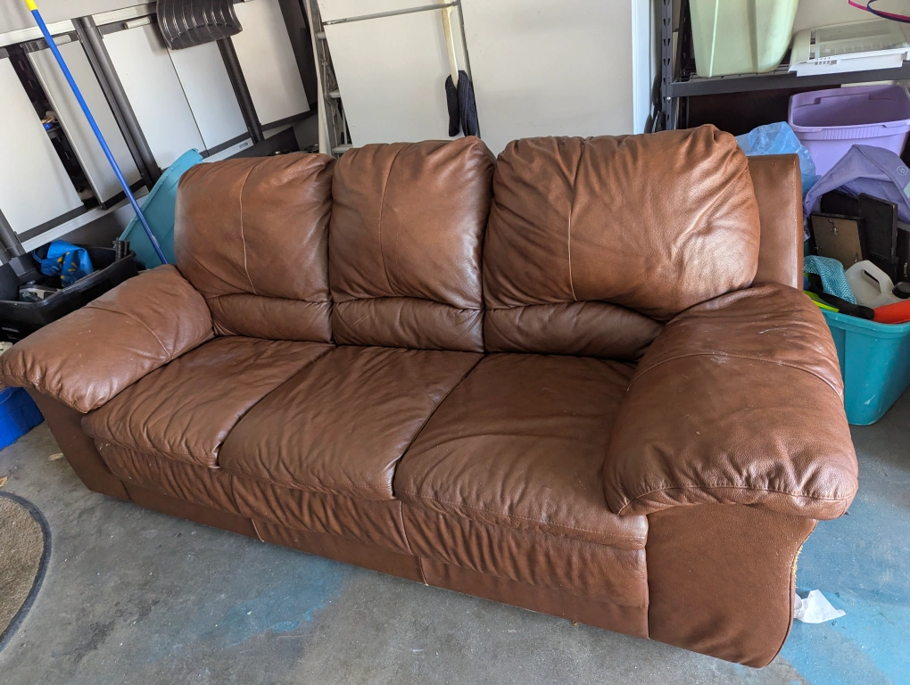 Selling a brown leather 3-seat sofa. It's a comfy couch, perfect for a living room or den! There are some signs of wear, as shown in the photos, but still lots of life left in it. small cat scratches can be polished out with beeswax.