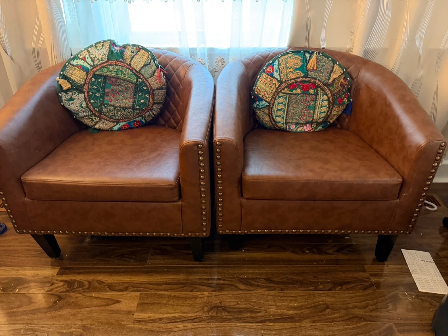 44Selling a pair of lovely brown leather accent chairs! They're a lovely shade of brown and would look fantastic in any living space. The chairs feature a stylish design with decorative nailhead trim. Pillows included!