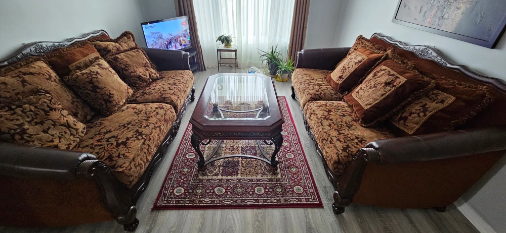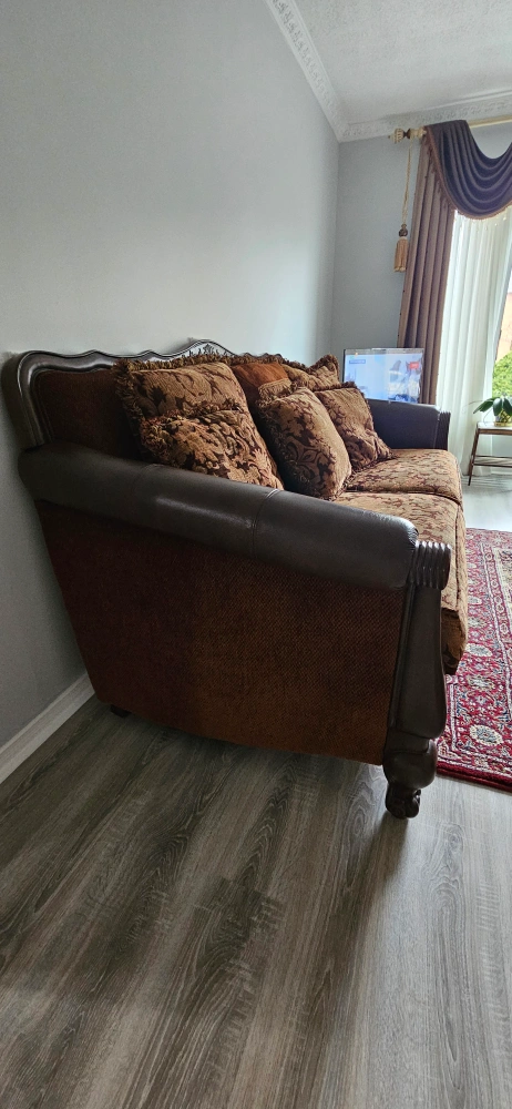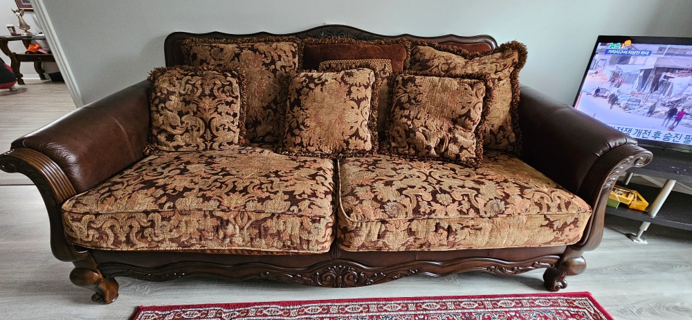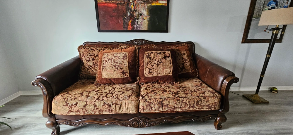 34Elegant sofa ×2. Brown leather and fabric upholstery. Ornate wooden frame. Includes several throw pillows. Cover can be removed for easy clean. Good condition. Coffee table is no longer available. x2 sofa- $800