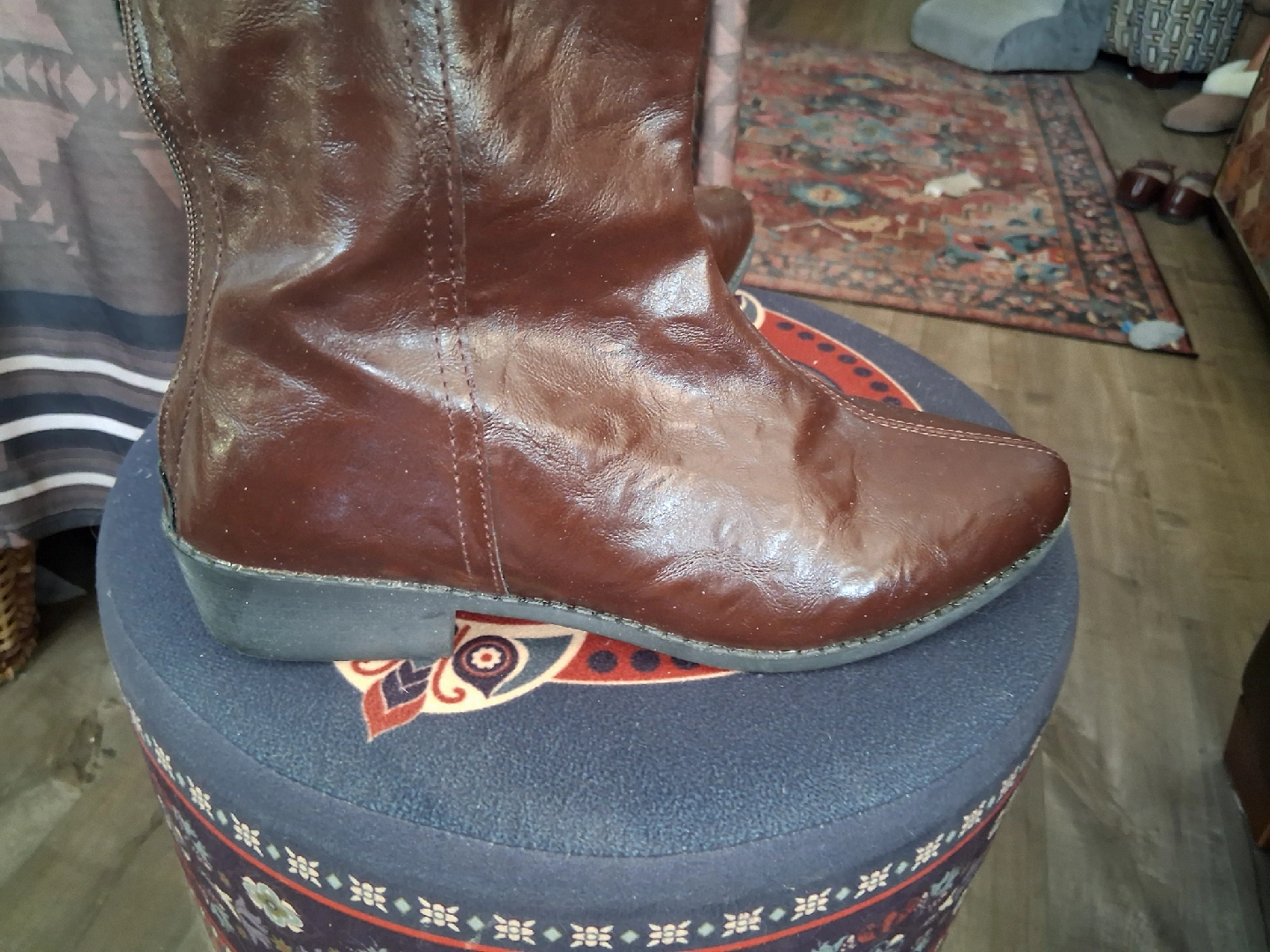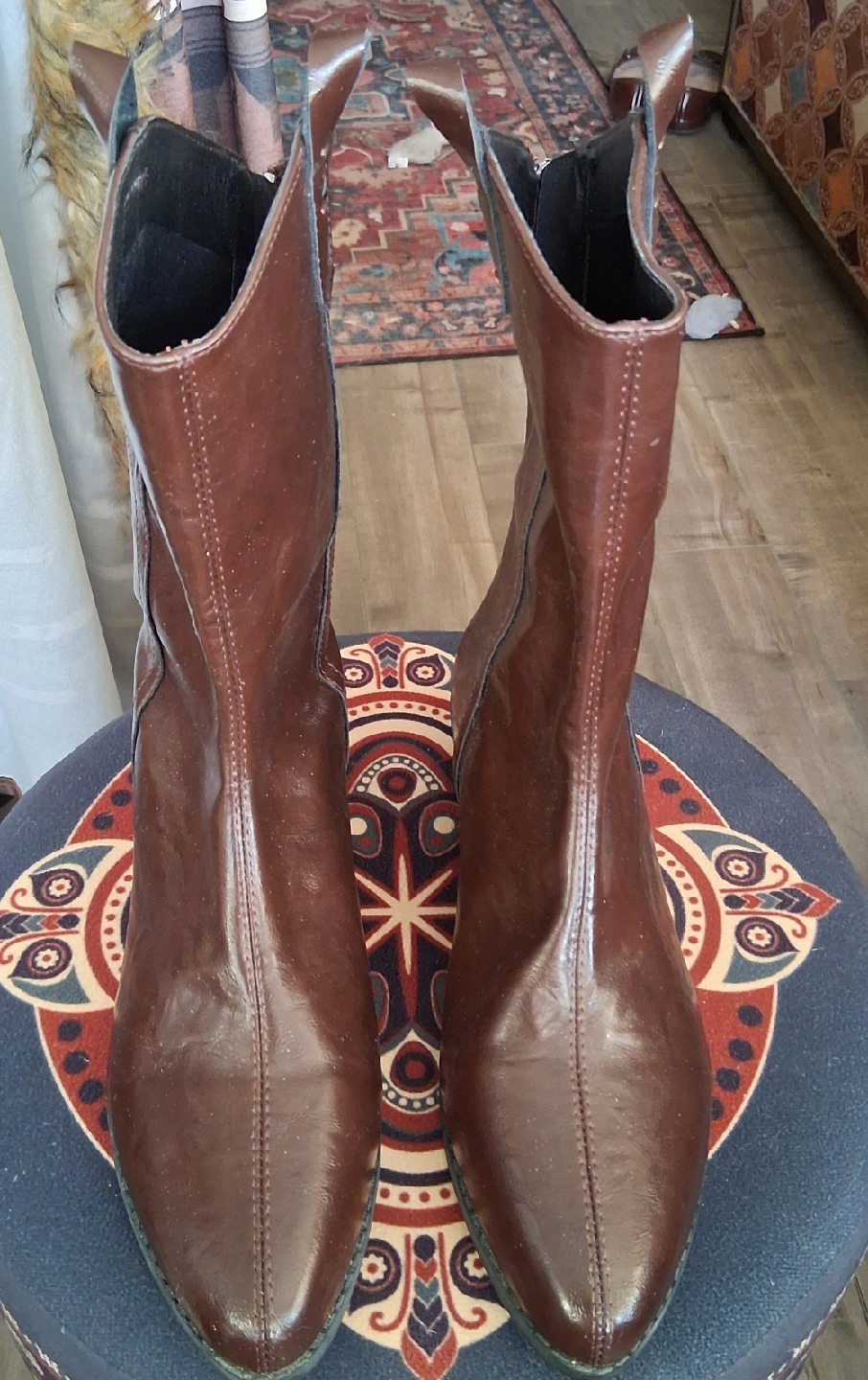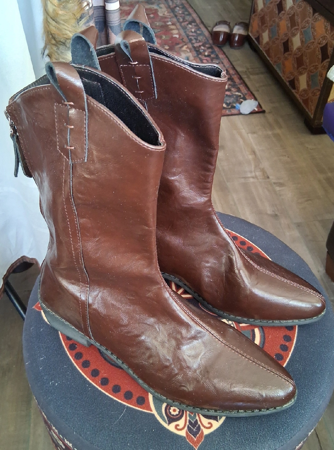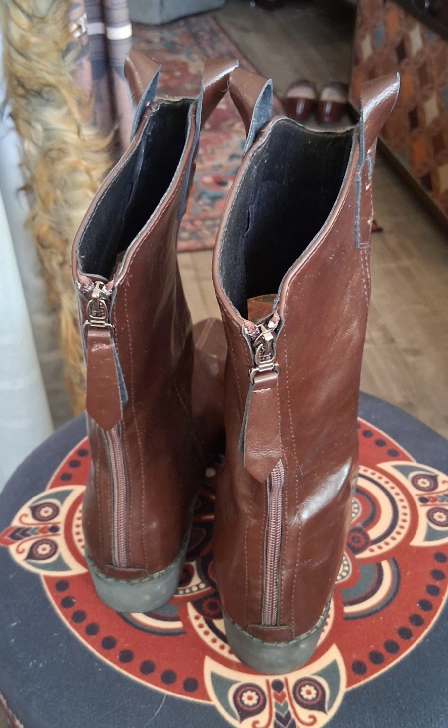 10These are a pair of brown leather (pu) ankle boots. They have a zipper in the back and are in like new condition. Perfect for adding a touch of style to any outfit! Size 43 (11).