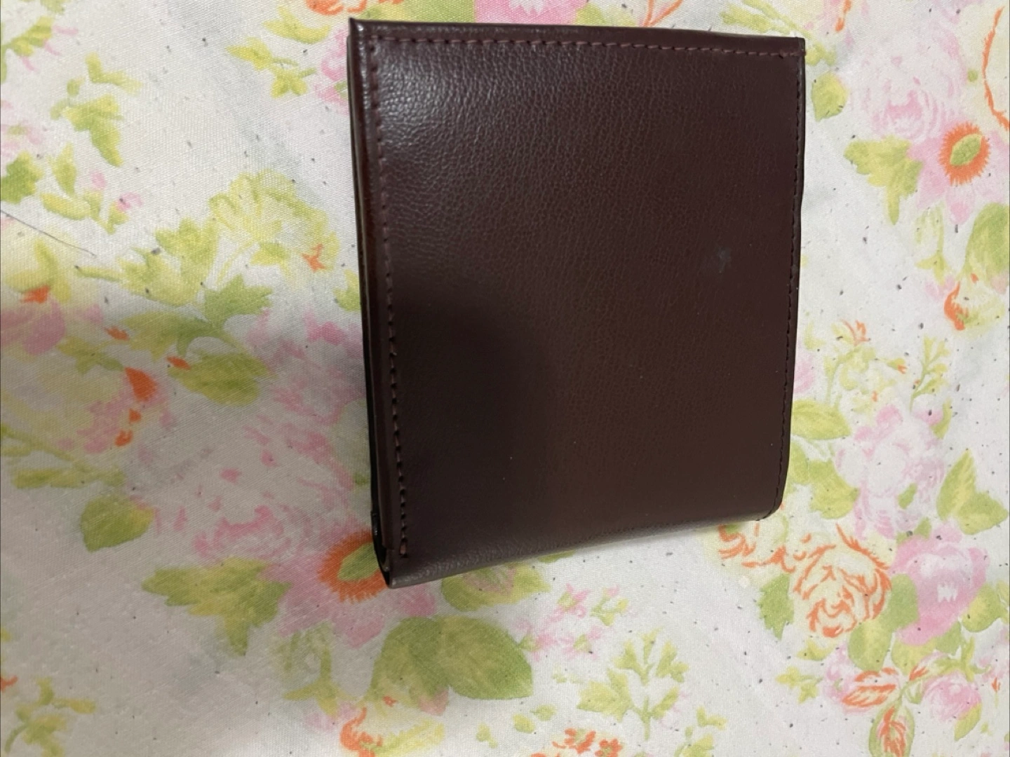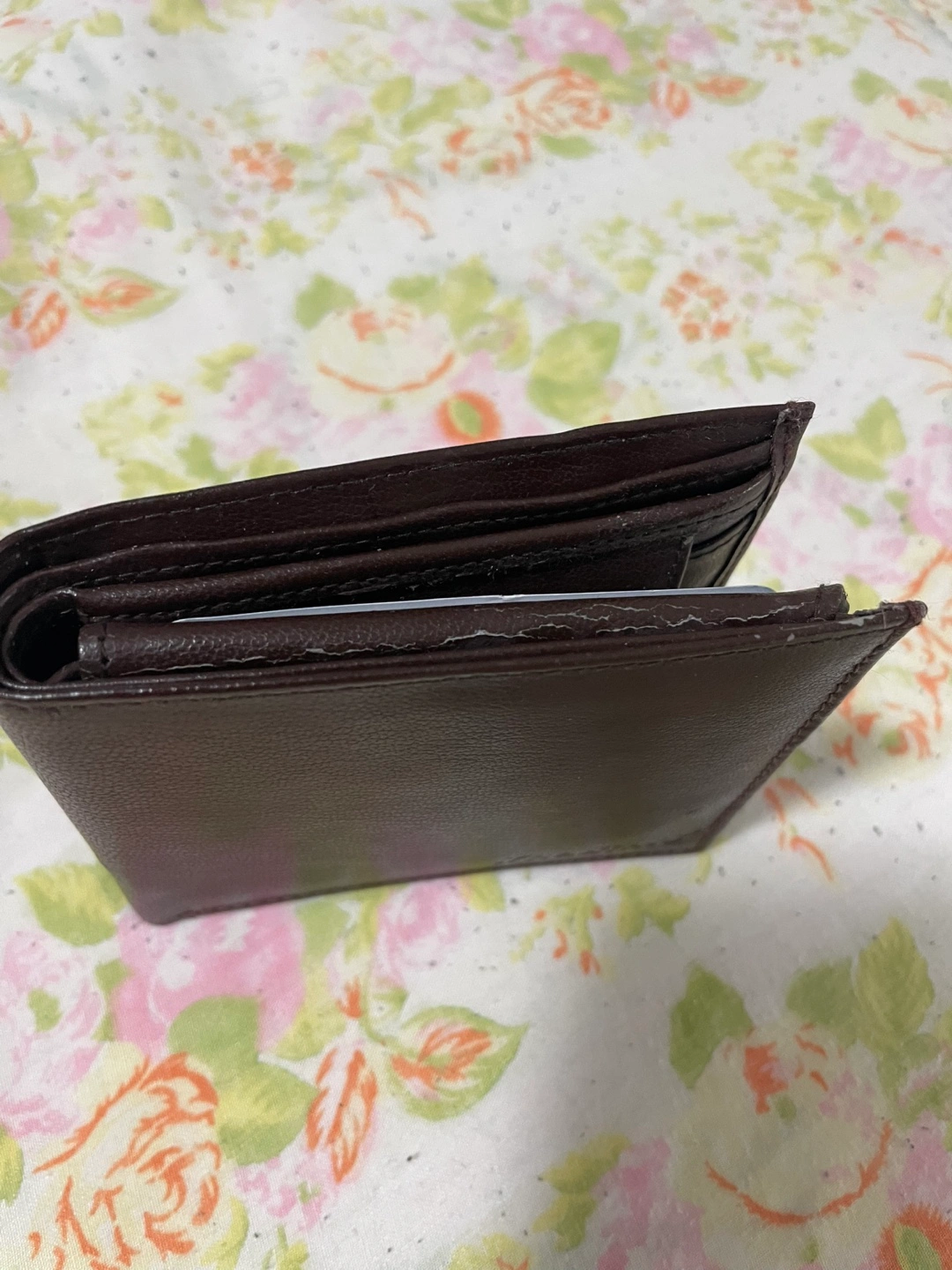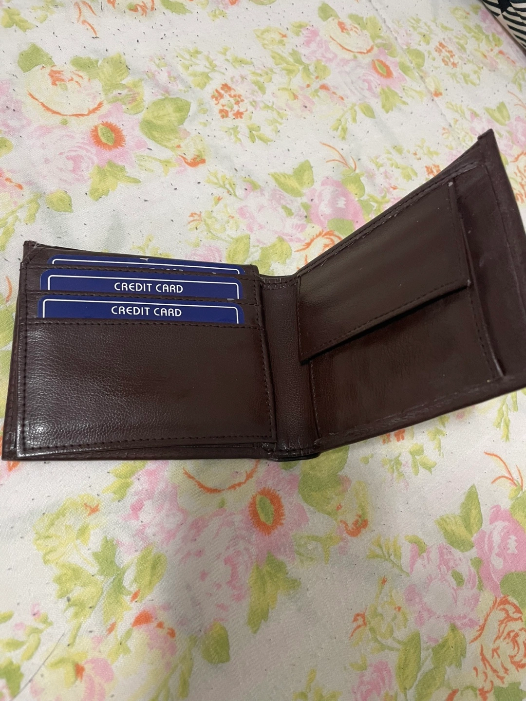 39Men's brown leather bifold wallet. Multiple card slots and a compartment for bills. Classic design. New but some wear and tear because of leather.