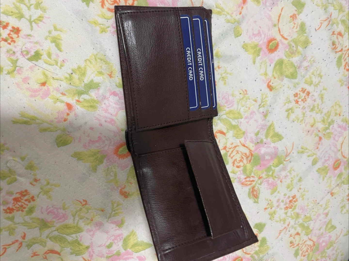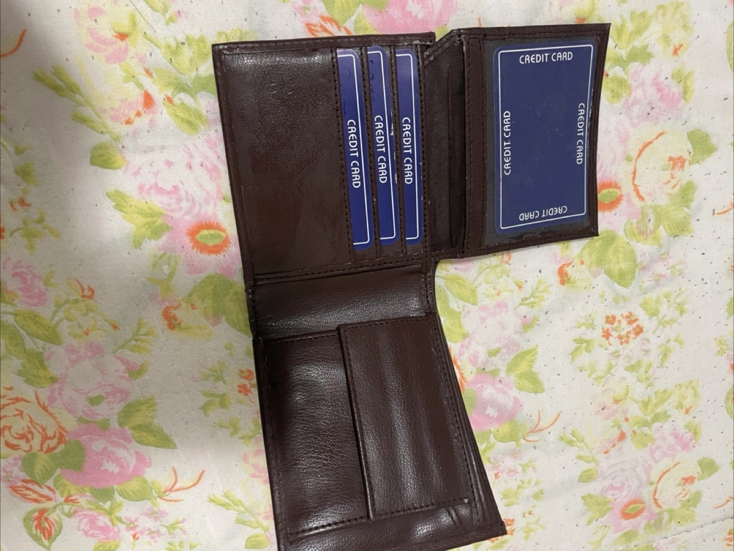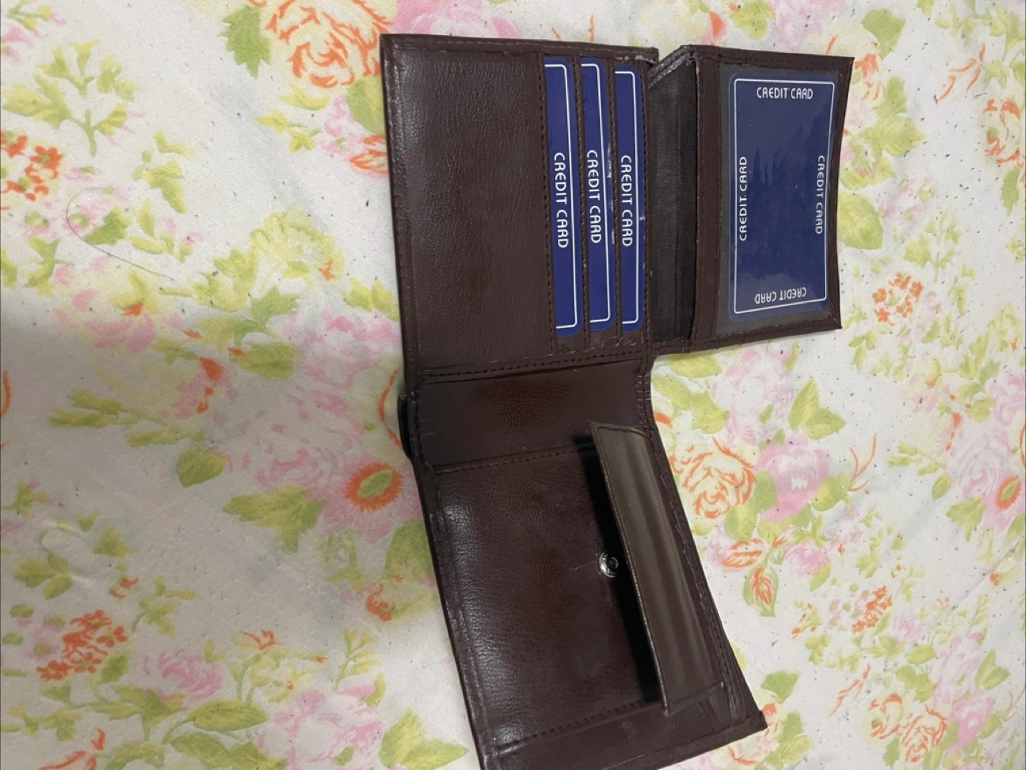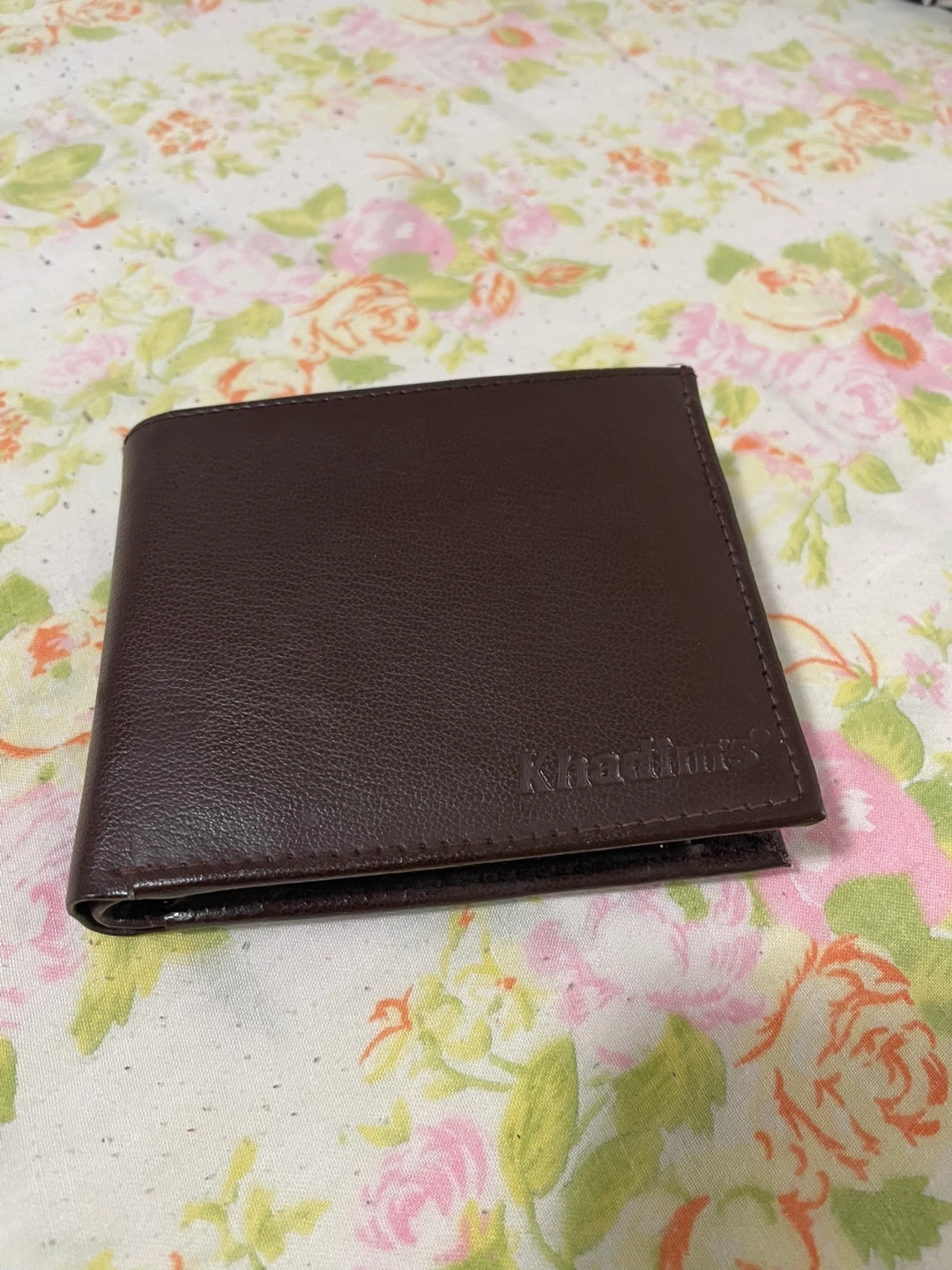39Men's brown leather bifold wallet. Multiple card slots and a compartment for bills. Classic design. New but some wear and tear because of leather.
