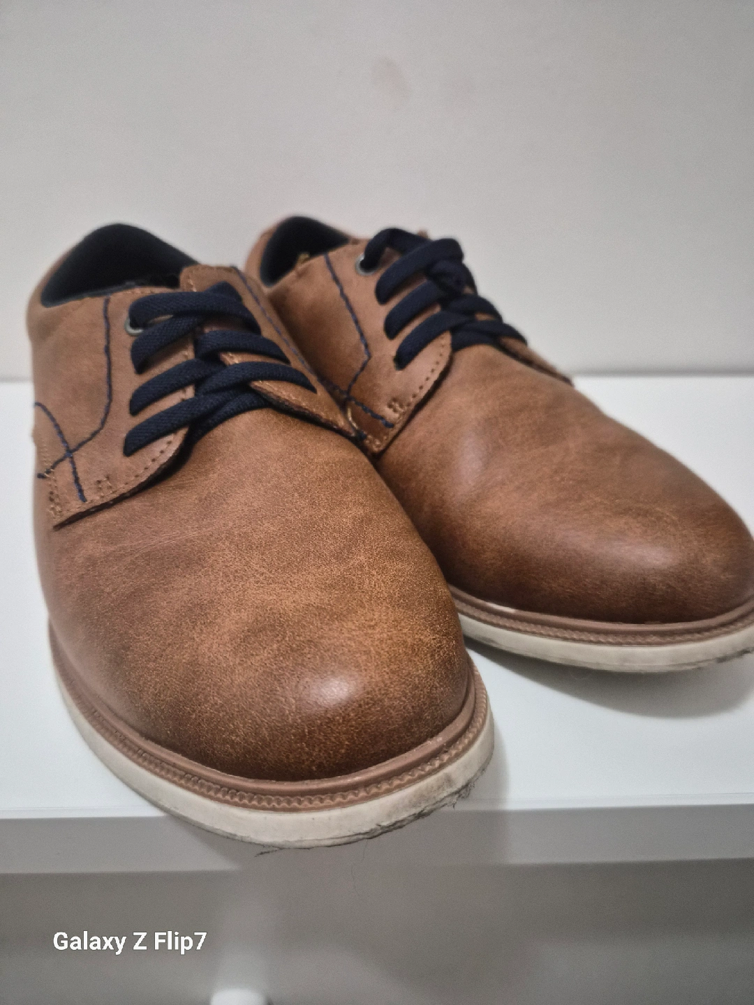10These are a pair of brown leather dress shoes for kids.. They feature a classic lace-up design with navy no-tie laces. They are in good condition and ready for a new owner! size 2