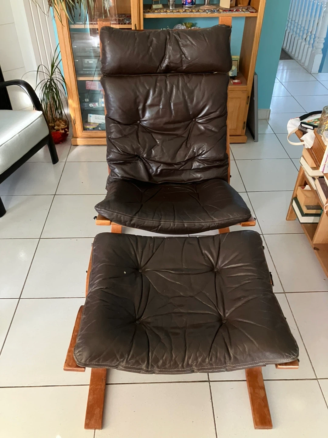 10Comfortable brown leather chair with a matching ottoman. The chair has a high back with a headrest and a padded seat. The ottoman is perfect for resting your feet after a long day. It's a great addition to any living room or den!