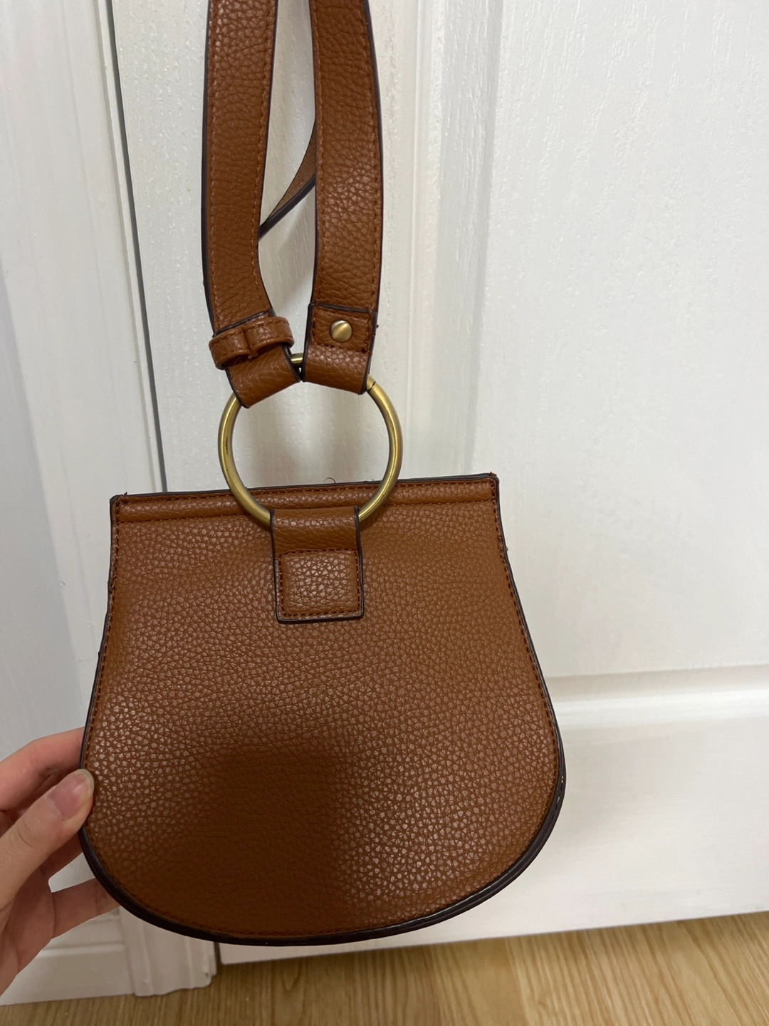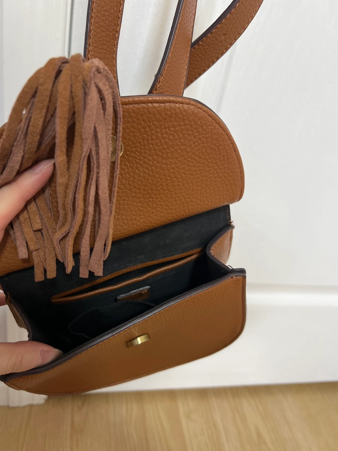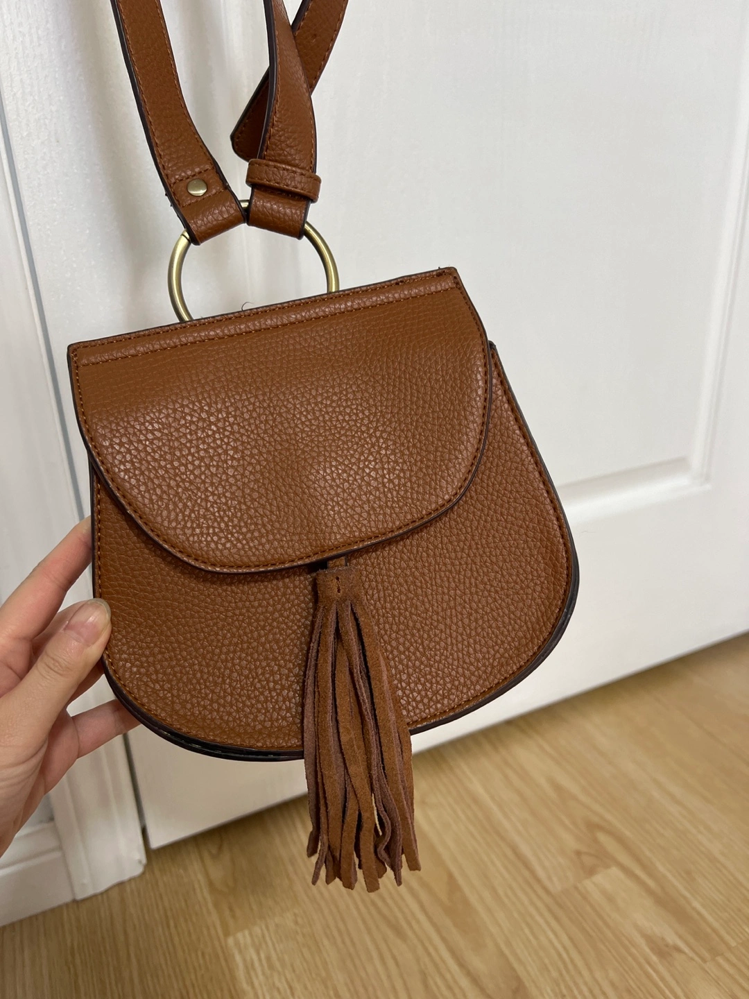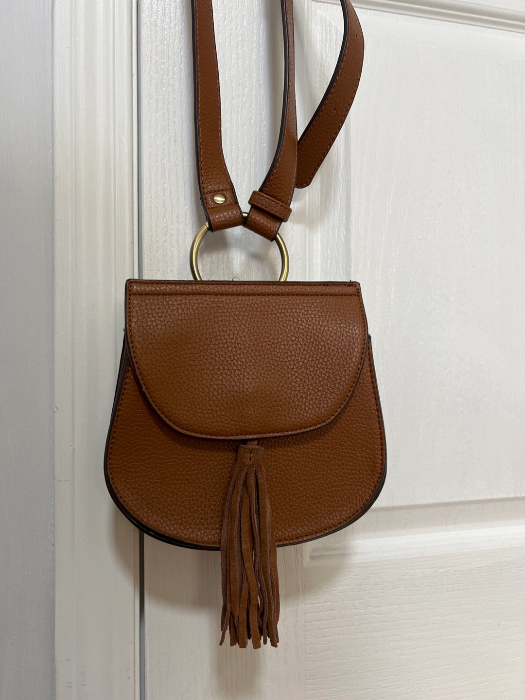 12Small brown crossbody bag. Features a half-moon shape, adjustable strap, gold-toned hardware, and a suede tassel. Interior pocket. Excellent for everyday use.