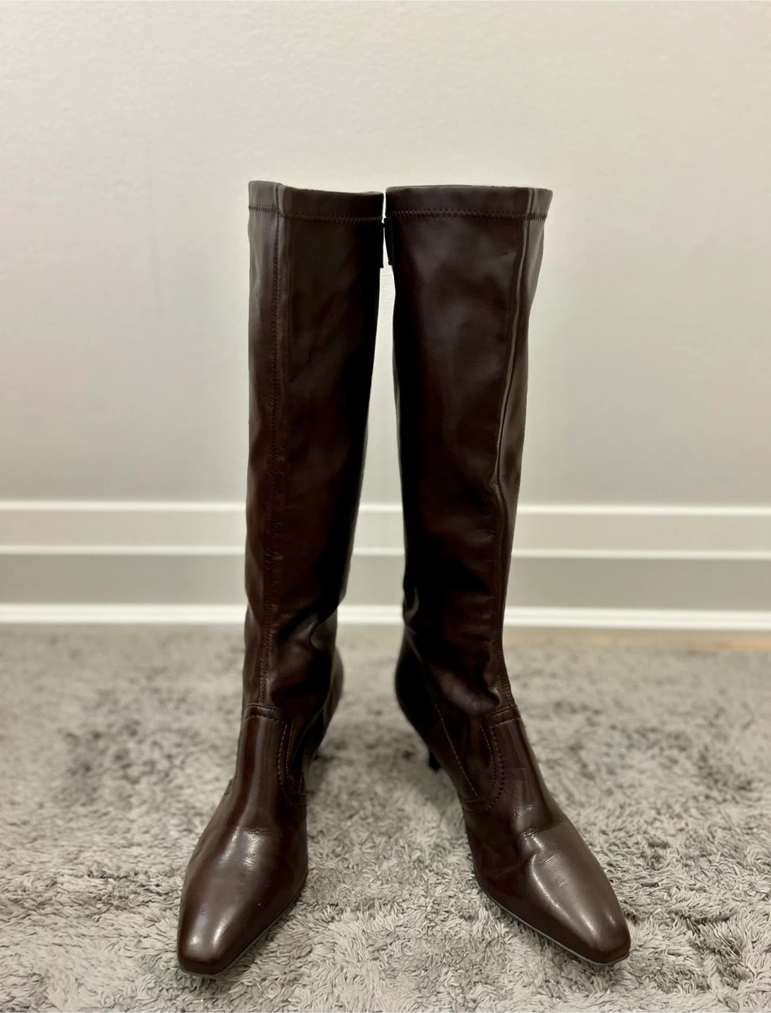 Franco Sarto Brown Leather Knee High Boots. These are a pair of stylish brown knee-high boots. They appear to be made of leather and feature a buckle detail at the top. Perfect for adding a touch of sophistication to any outfit! Size 7. $120 OBO. Pick up Thorold