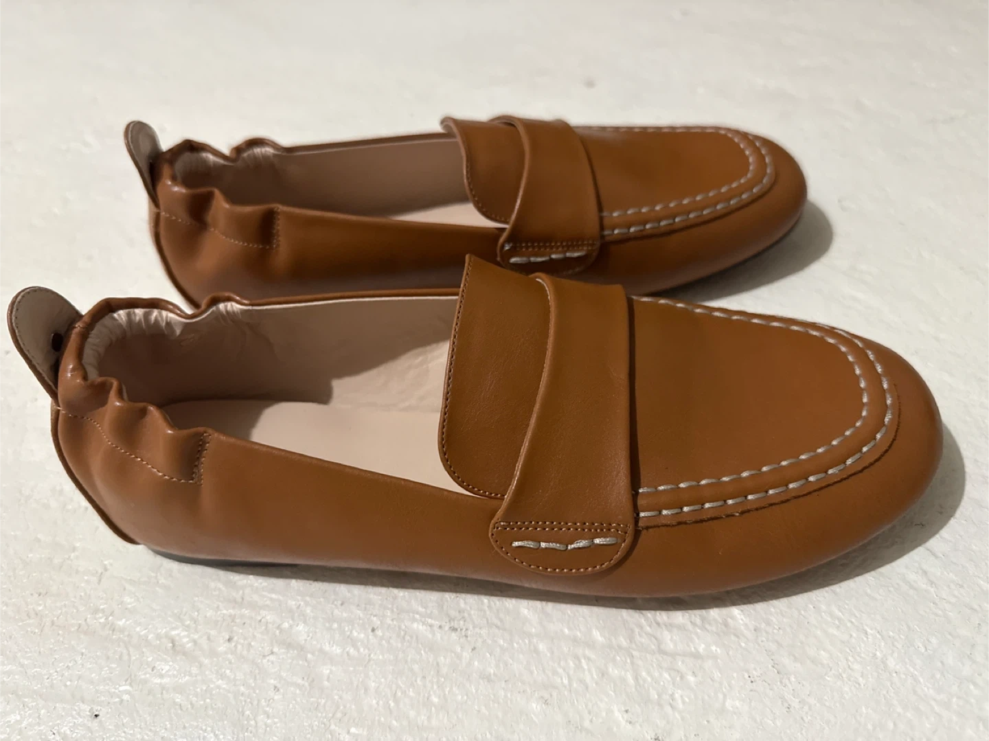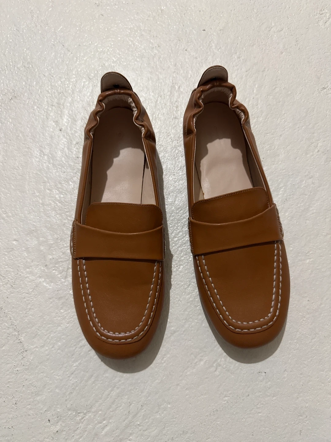 60I'm selling a pair of brown leather loafers in size 7. They are in great condition and are perfect for everyday wear. The loafers feature a classic design with white stitching and a comfortable fit. They're a stylish and versatile addition to any wardrobe! Purchased bigger size and only used once!
